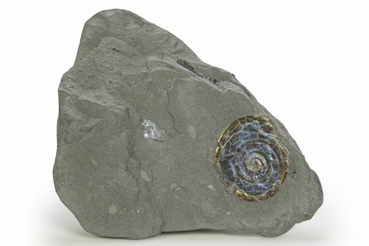 This plate of rock contains a brilliantly iridescent ammonite (Psiloceras planorbis, 1.85" wide) from England. Its naturally iridescent shell displays some beautiful blues, greens, and fiery oranges. Like most fossils from the Blue Lias Formation, these ammonites have been compressed and flattened by the same geological processes of heating and pressure, forming this iridescence.