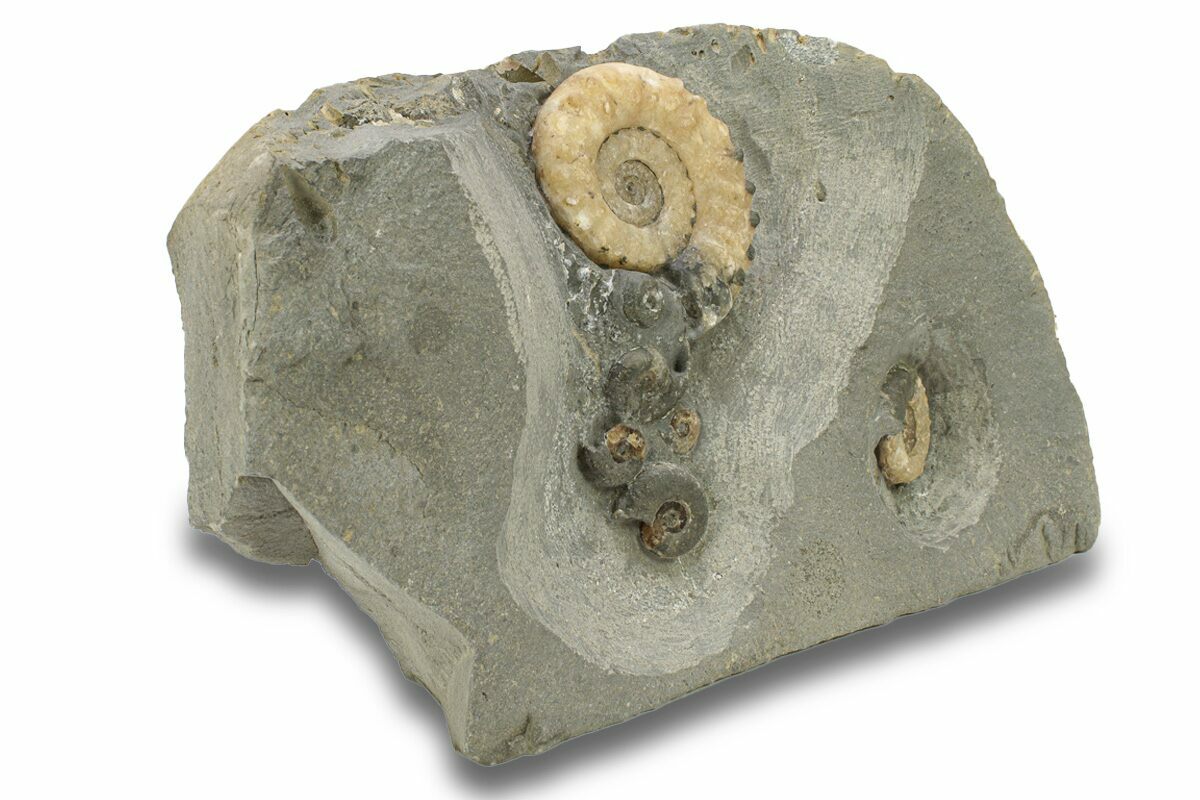 This 7.3" wide nodule contains multiple calcite replaced ammonite (Microderoceras birchi) fossils from Dorset, England. They have been nicely prepared using mechanical tools to remove the surrounding limestone. The rock has been cut flat so that it stands up nicely without the need for a display stand.