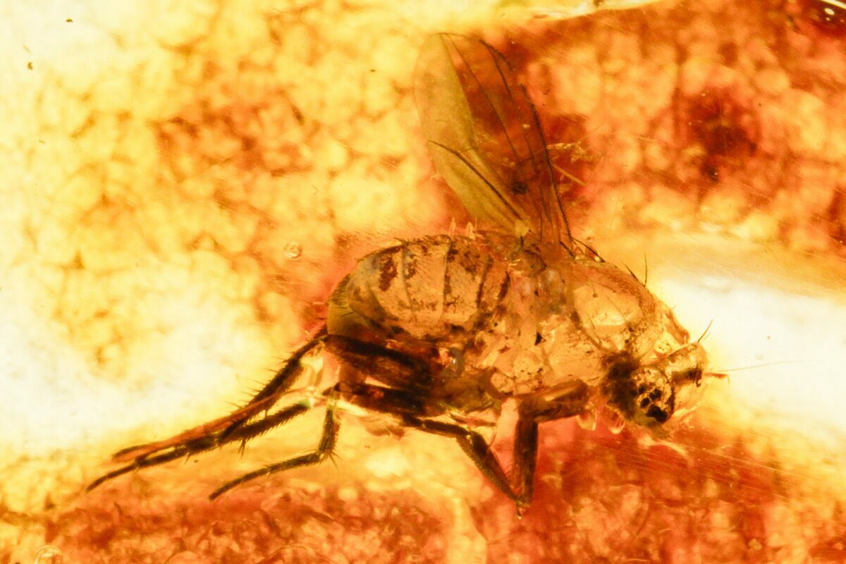 This is a polished piece of copal from Colombia. It contains multiple fossil flies (order Diptera), a wasp (order Coleoptera), and a small spider (order Araneae). The copal bears gorgeous golden honey coloration, measures 2.75" wide, and weighs 16.3 grams. One side of the specimen has been polished to a glossy-finish.