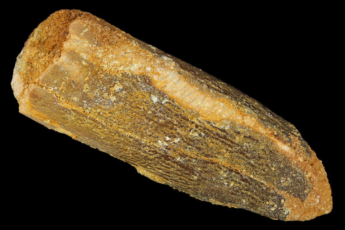 This is a 1.88" long tooth from a Moroccan titanosaur that is currently unidentified. It comes from the Late Cretaceous, Kem Kem Beds of Morocco, home to such meat eating giants as Spinosaurus and Carcharodontosaurus.