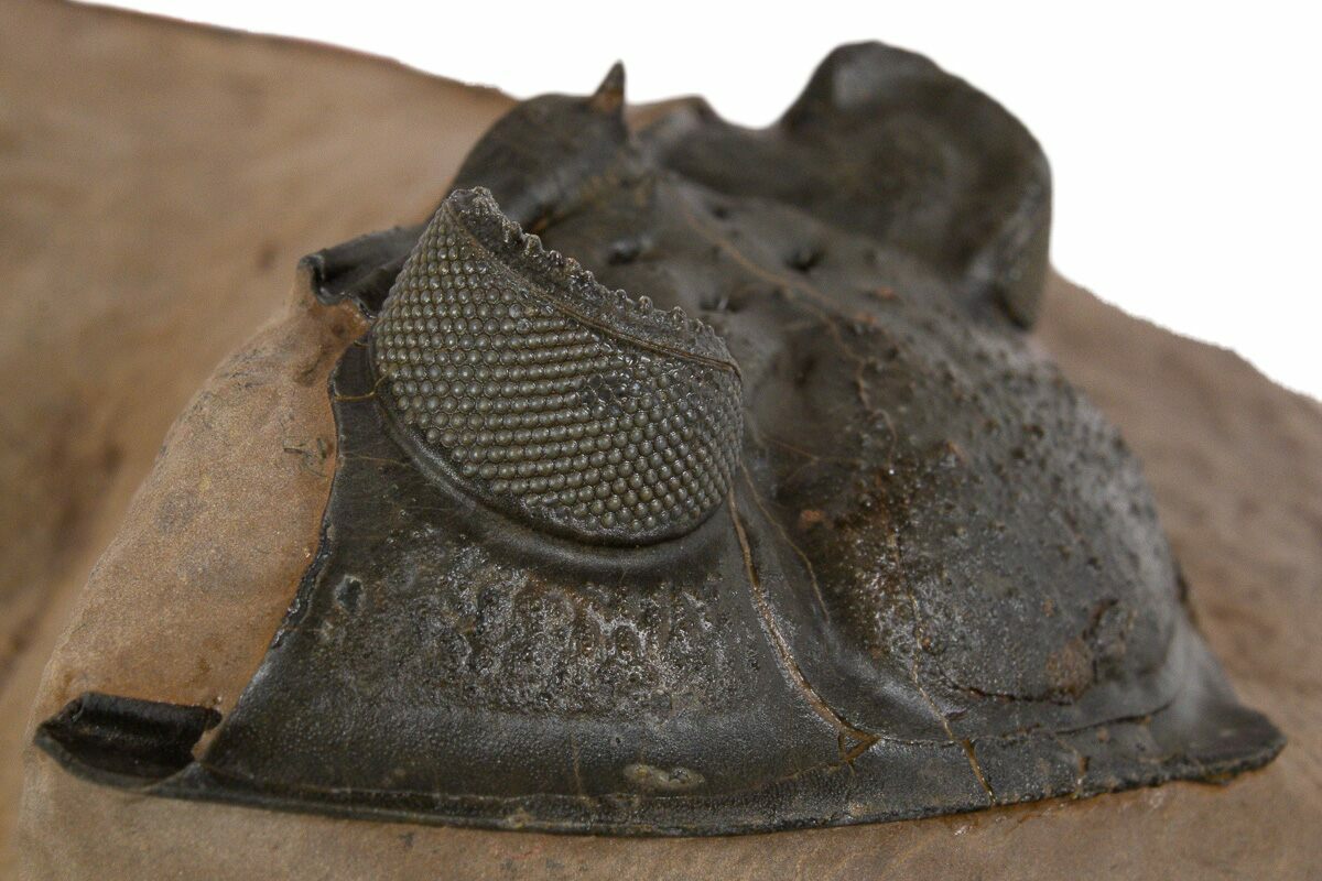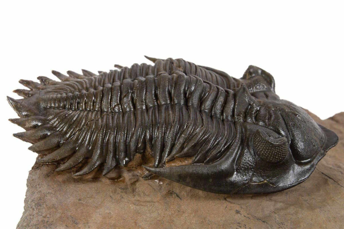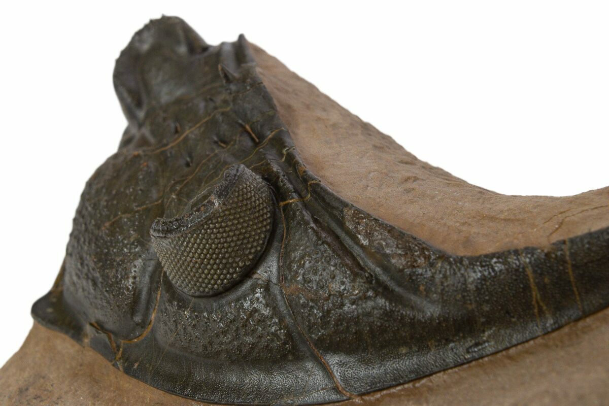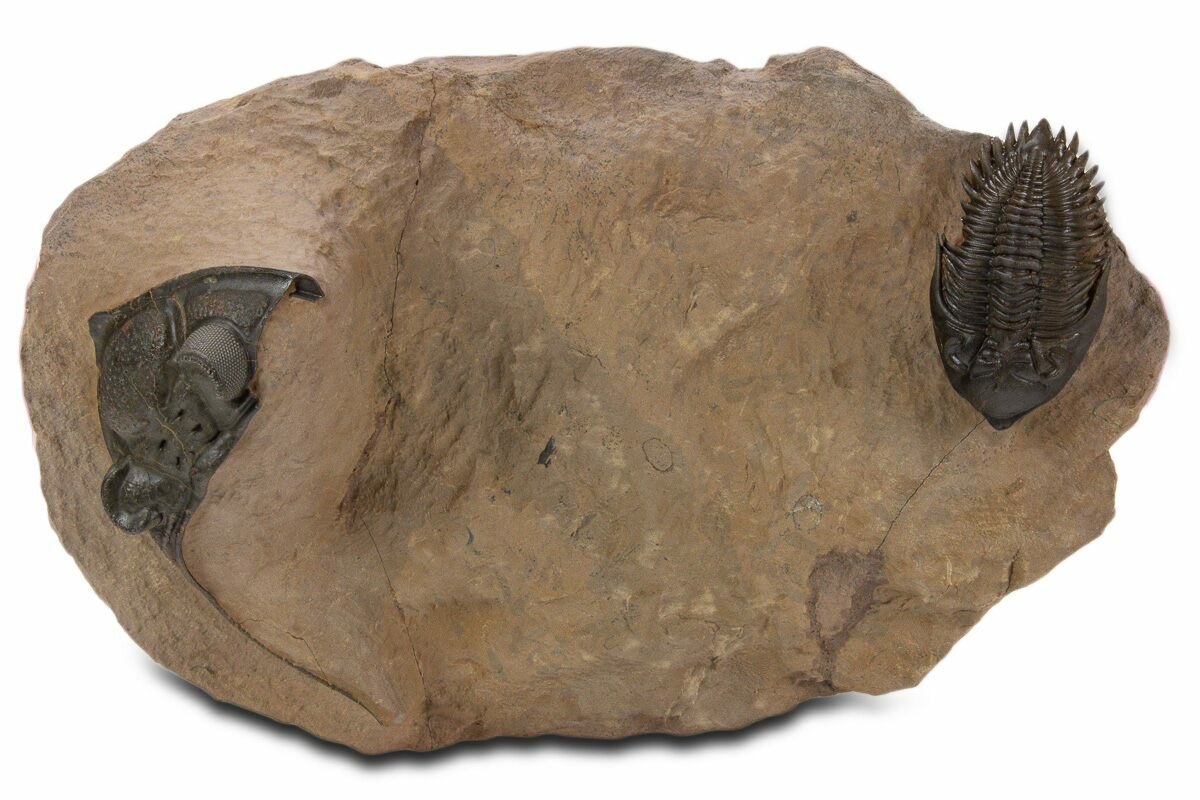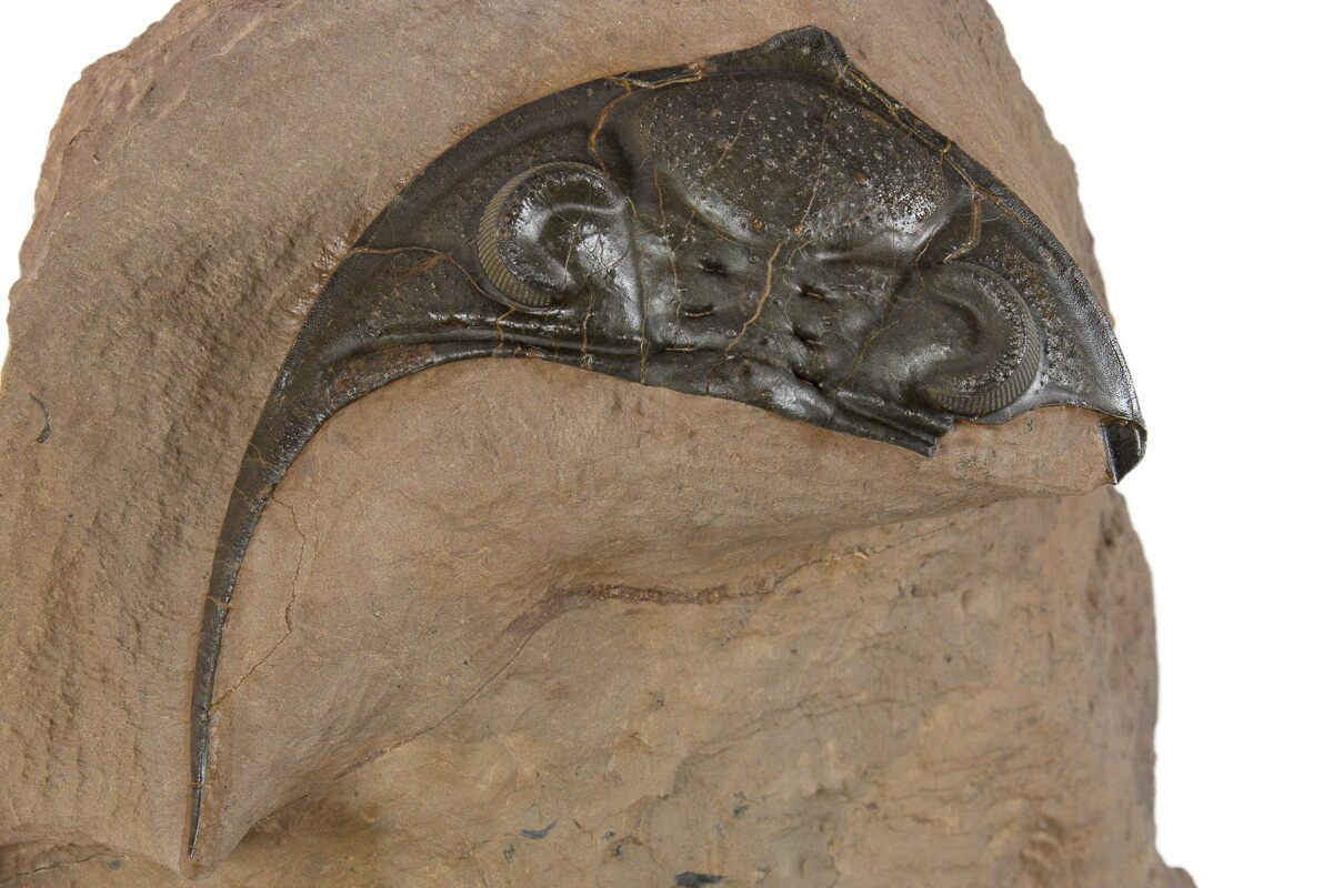 This is a beautiful, chocolate-brown, 1.9" long specimen of Metacanthina issoumourensis collected near Lghaft, Morocco. It is folded over over, but has been meticulously prepared from both sides, creating a stunning display. It has about 2-5% shell restoration along repaired cracks. There is also the head of a Zlichovaspis trilobite present on the rock.