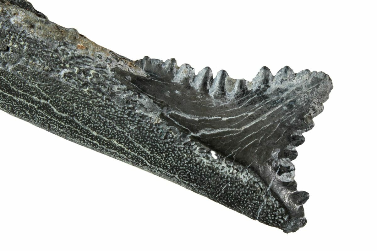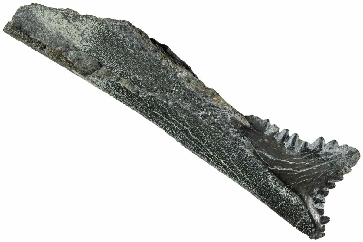 This is a very unusual and hard to acquire offering of a fossil tooth and jaw section from the Carboniferous-aged shark, Edestus heinrichi. These rare teeth are recovered deep underground in the coal mines of Illinois. The tooth is in excellent condition with glossy black-grey enamel preservation, well defined serrations, and a nice tip. Most of these teeth are found broken or worn.