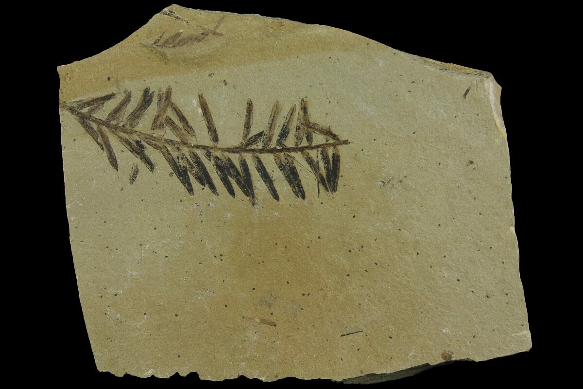 This is a Metasequoia (Dawn Redwood) fossil from the Muddy Creek Formation of Beaver Head County, Montana. The frond is 1.9" long (not including the curve). The Metasequoia genus was considered extinct until a living population was discovered in China in 1941. This makes the dawn redwood a classic example of a "living fossil".