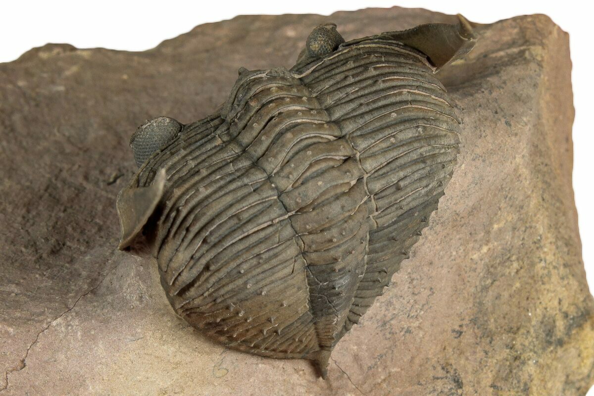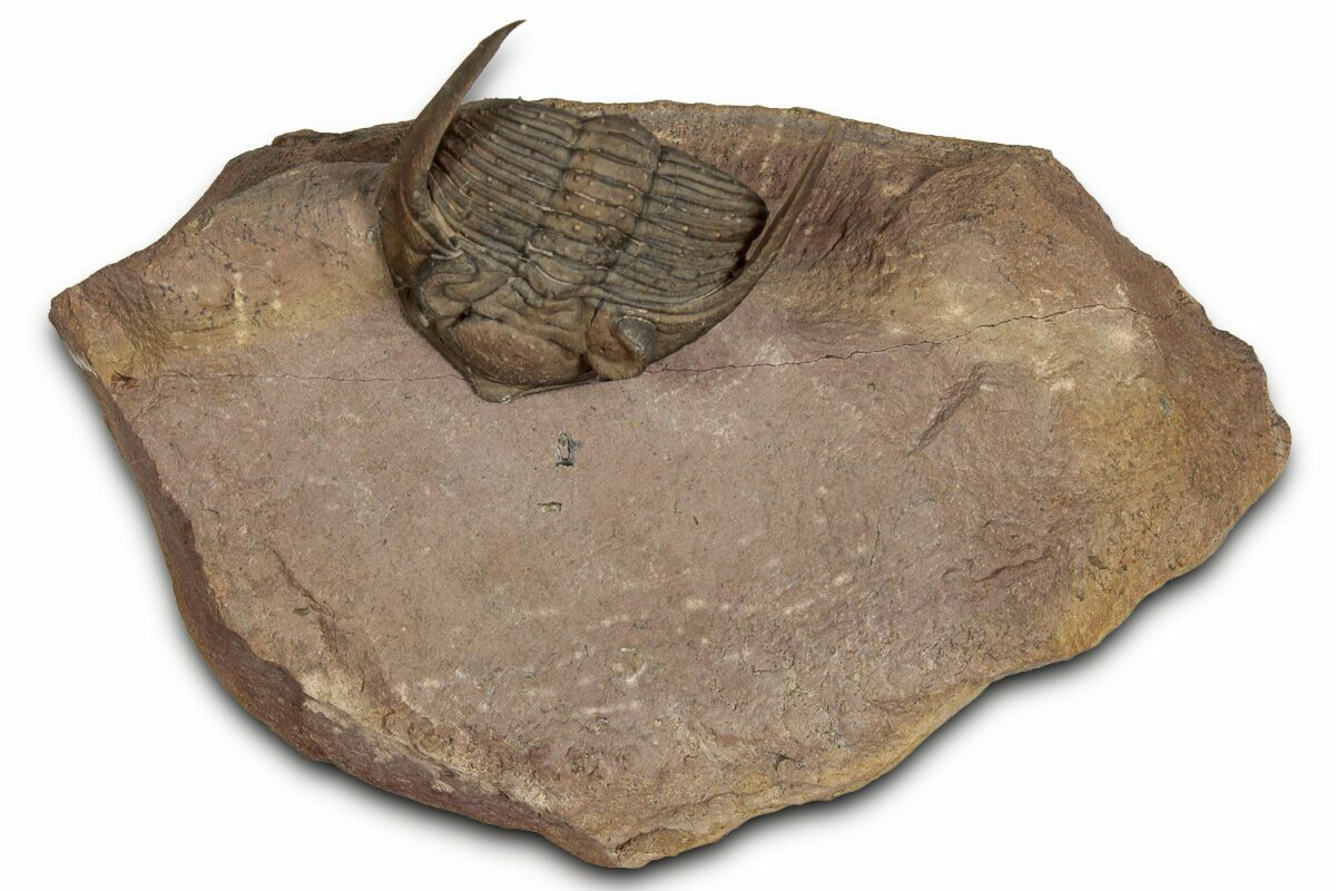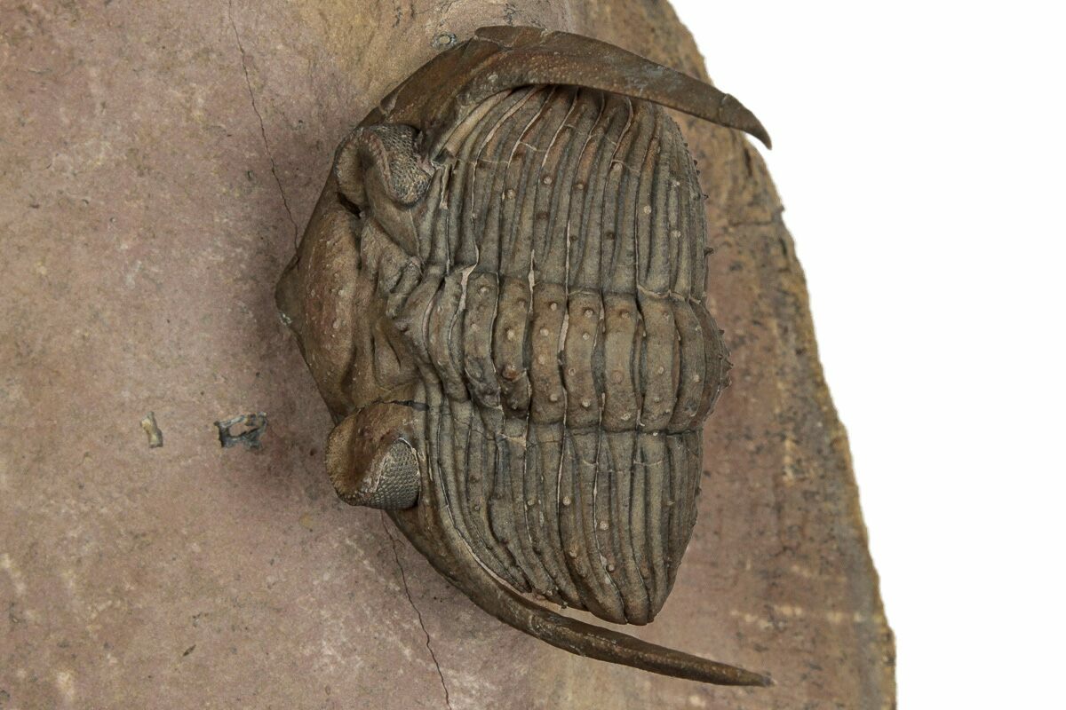This is an enrolled, 1.9" long specimen of Zlichovaspis spinifera collected near Lghaft, Morocco. There are preserved eye facets in both eyes with free-standing genal spines. There are tiny spines preserved all over its thorax. It has no restoration.