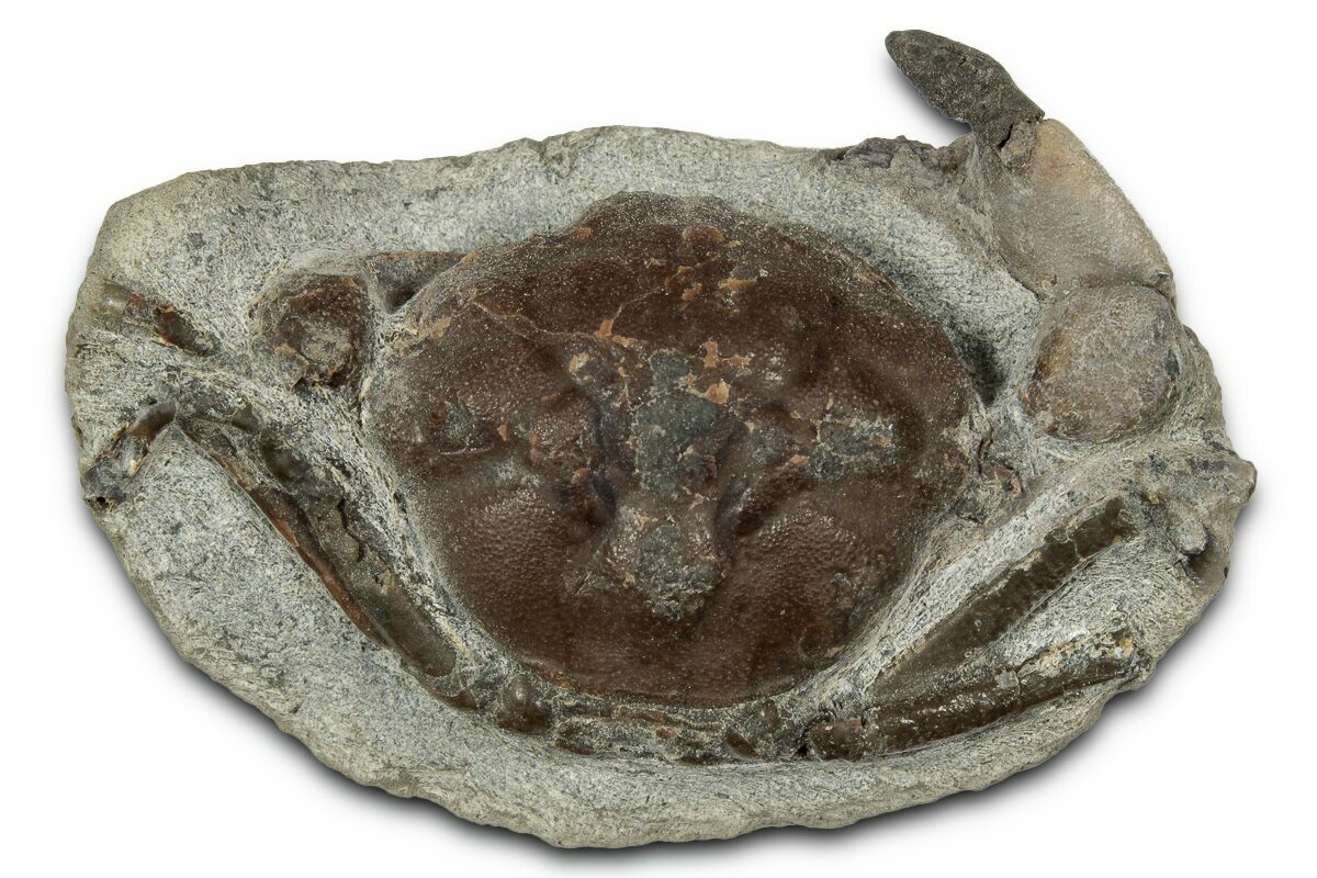 There is restoration to the right pincer of this crab. One edge of the nodule has been cut flat for aesthetic presentation of the fossil.