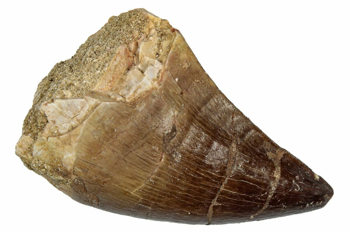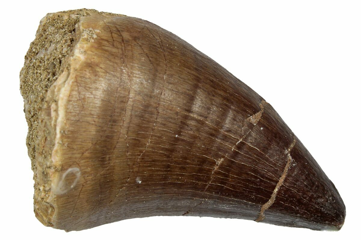 This is a 1.9" fossil mosasaur (Thalassotitan atrox) tooth from the Upper Cretaceous phosphate deposits in the Oulad Abdoun Basin of Morocco.