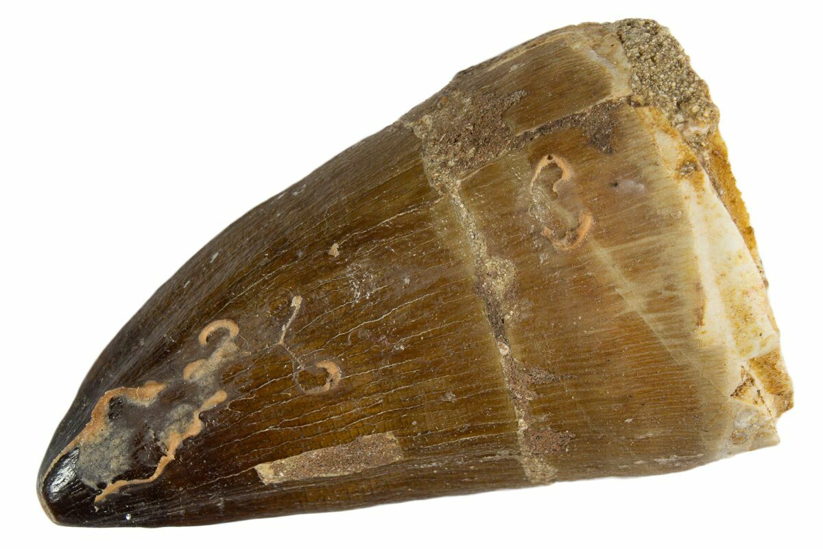 This is a 1.9" fossil prognathodontid mosasaur tooth from the Upper Cretaceous phosphate deposits in the Oulad Abdoun Basin of Morocco.