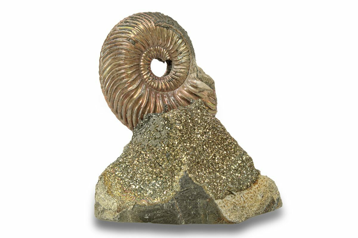 This is an interesting and colorful pyritized ammonite (Quenstedticeras sp.) display. The ammonite was collected from the Middle Jurassic age deposits along the banks of the Volga River near Saratov, Russia. It has been mounted to this section of iridescent pyrite ("rainbow pyrite") encrusted rock to create this alluring display.