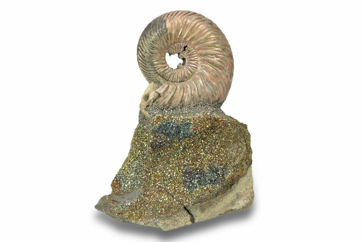 This is an interesting and colorful pyritized ammonite (Quenstedticeras sp.) display. The ammonite was collected from the Middle Jurassic age deposits along the banks of the Volga River near Saratov, Russia. It has been mounted to this section of iridescent pyrite ("rainbow pyrite") encrusted rock to create this alluring display.