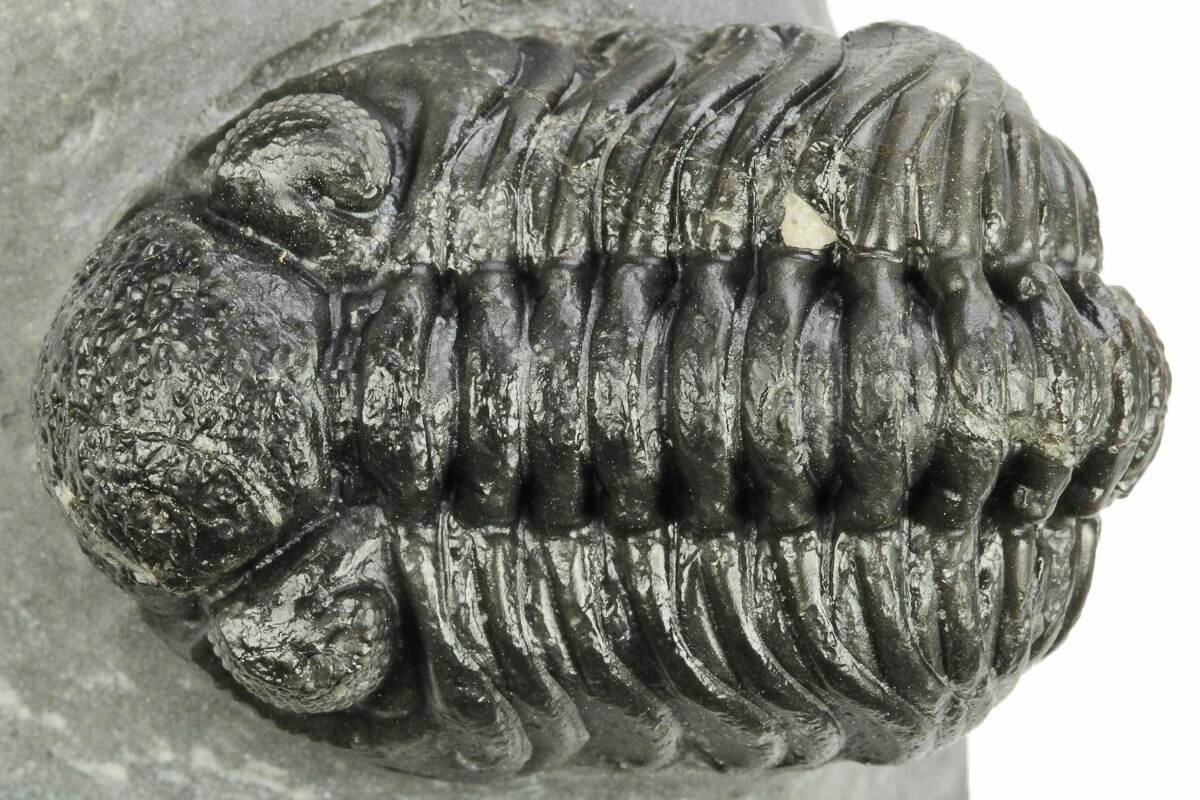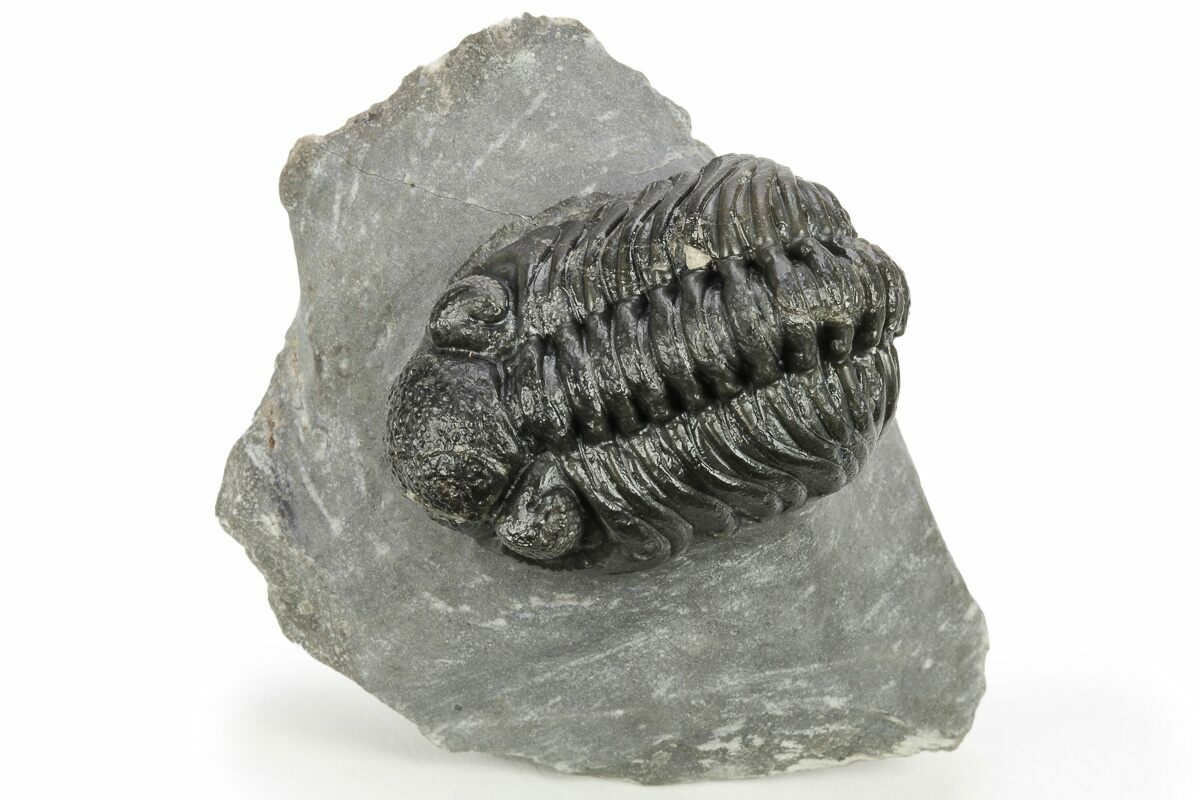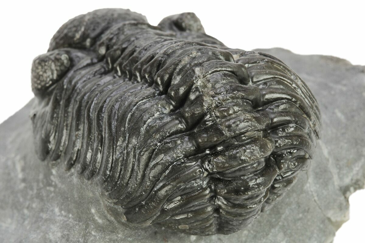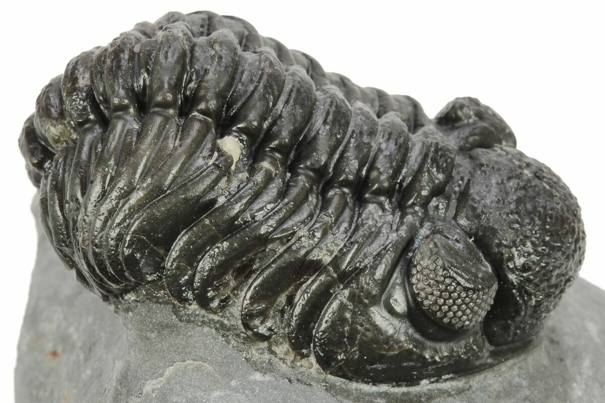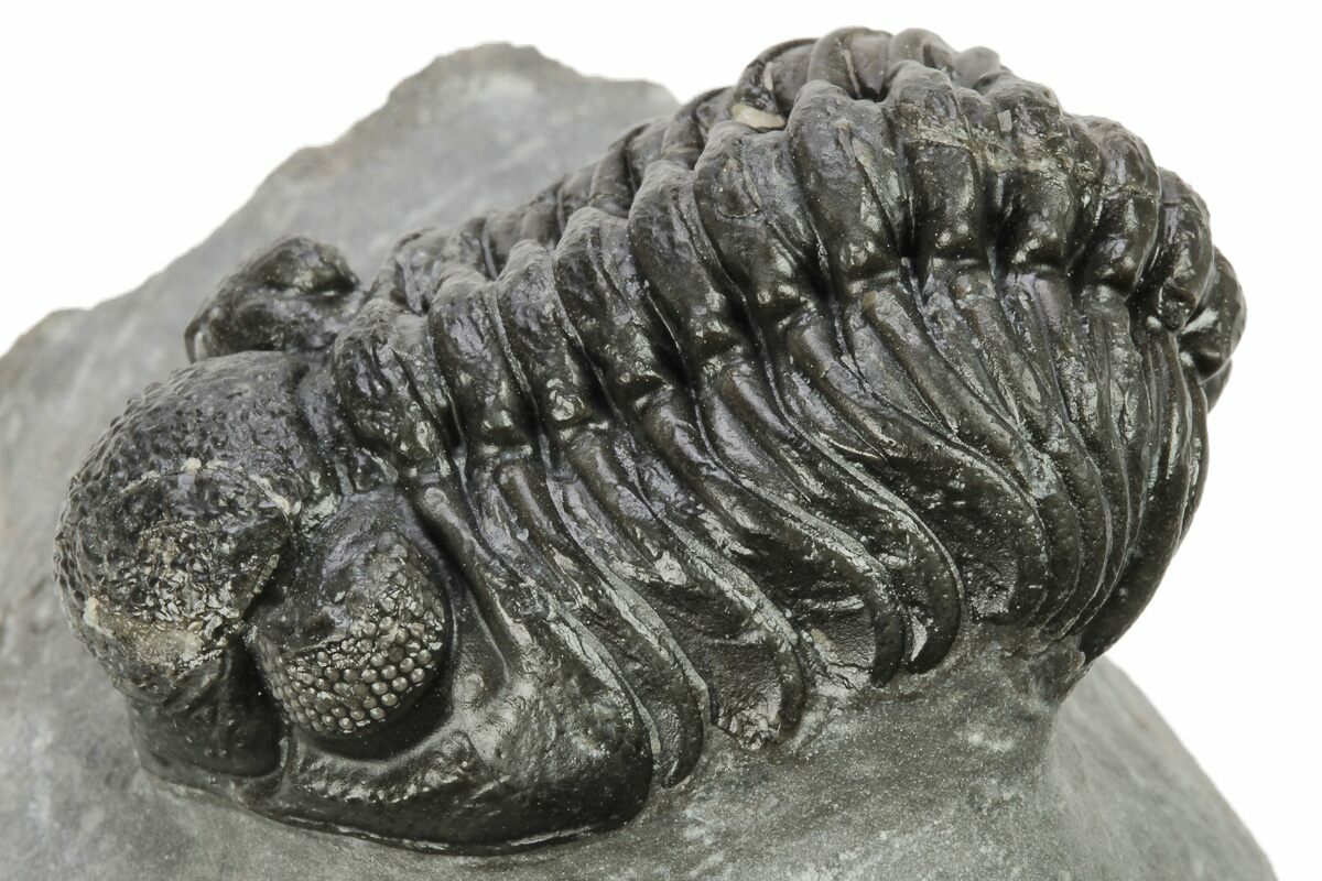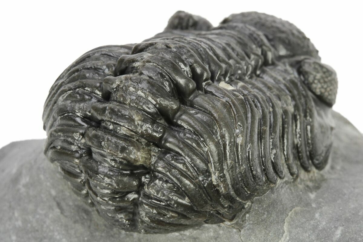 This is a 1.9" long, phacopid (Adrisiops weugi) trilobite from Jbel Oudriss, Morocco. Adrisiops had been informally referred to as 'smiley Phacops' until it was described as the type species of a new genus in 2017. It is one of the less frequently seen genus of phacopids from Morocco.