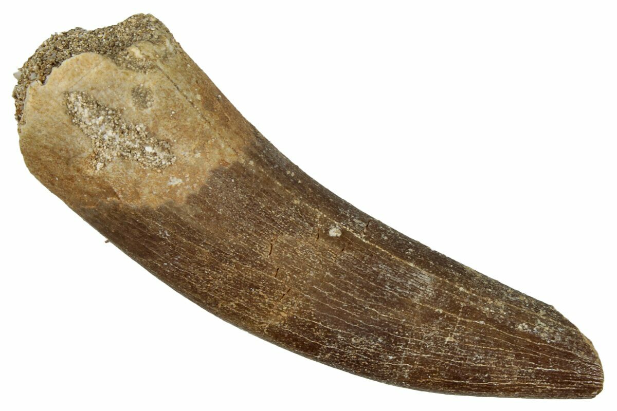 This is a 1.91" tooth from the Cretaceous marine reptile Zarafasaura oceanis, a long-necked plesiosaur known from the phosphate-rich Oulad Abdoun Basin of Morocco. The enamel displays nice preservation and natural coloration.