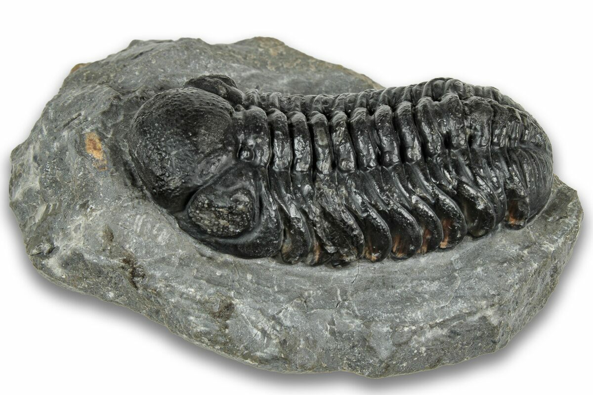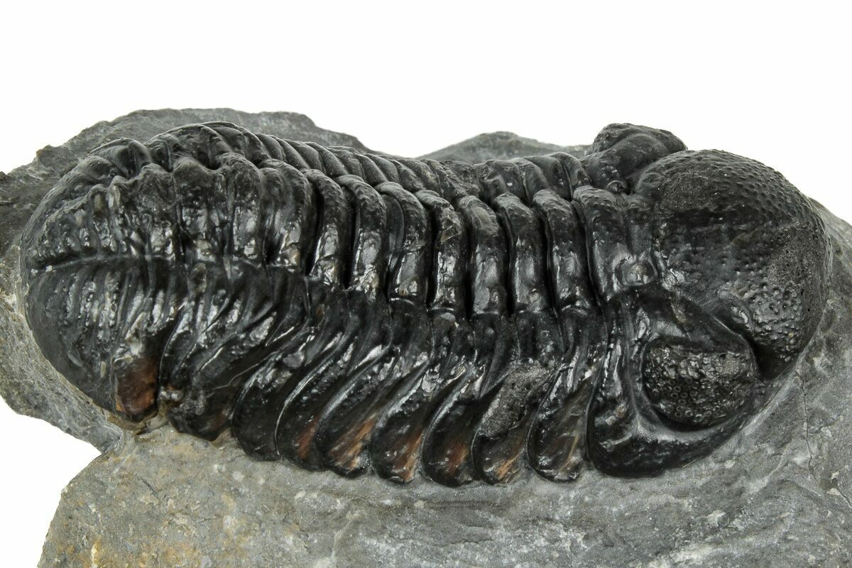 This is a detailed, 1.95" long Austerops trilobite from Ofaten, Morocco. Some eye facets can be seen in both eyes. It has about 3-4% shell restoration in total, primarily on its glabella.