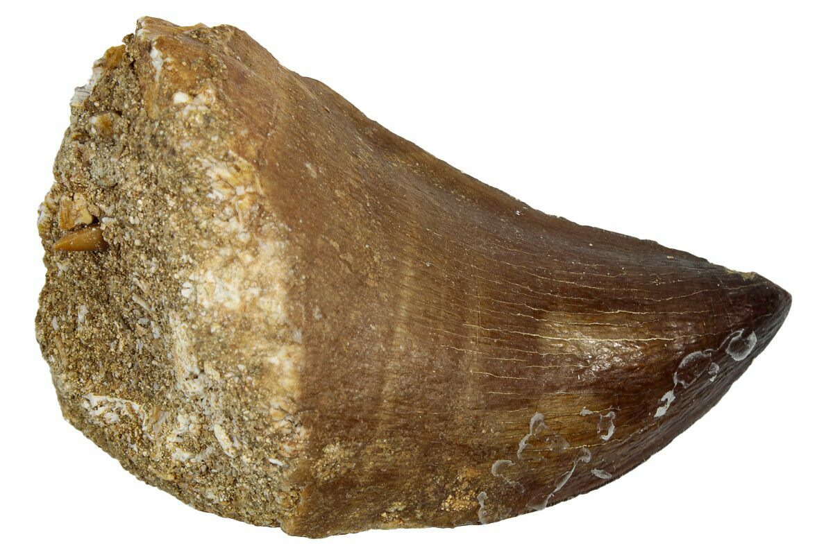This is a 1.95" fossil mosasaur (Thalassotitan atrox) tooth from the Upper Cretaceous phosphate deposits in the Oulad Abdoun Basin of Morocco.