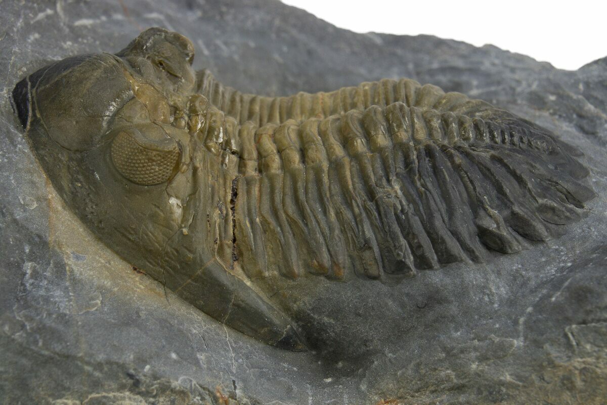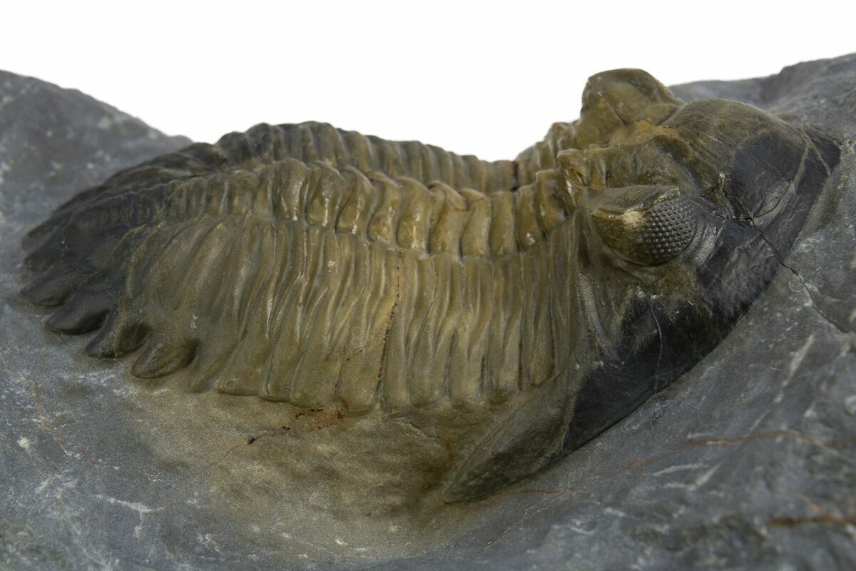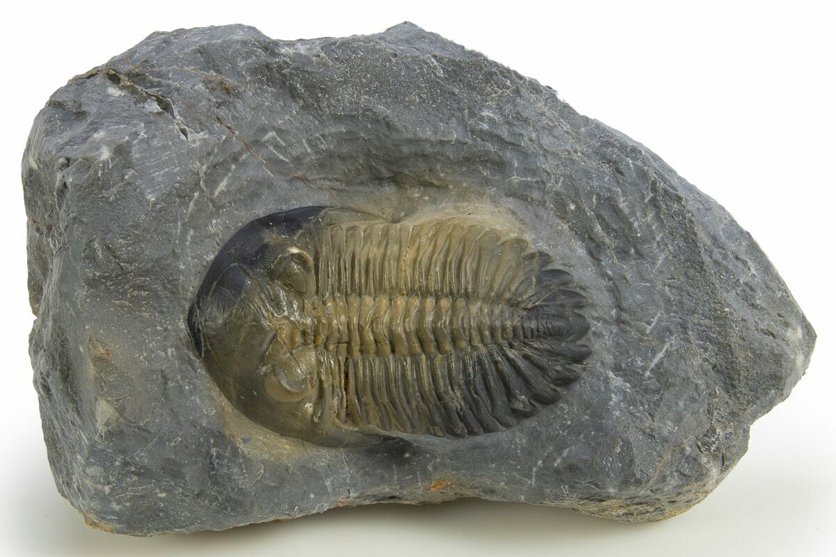 This is a 1.95" long Hollardops trilobite fossil quarried near Ofaten, Morocco. It has visible eye facet preservation in both eyes. It has a natural, multi-toned shell coloration. There is about 2-3% shellr estortion along a repaired crack.