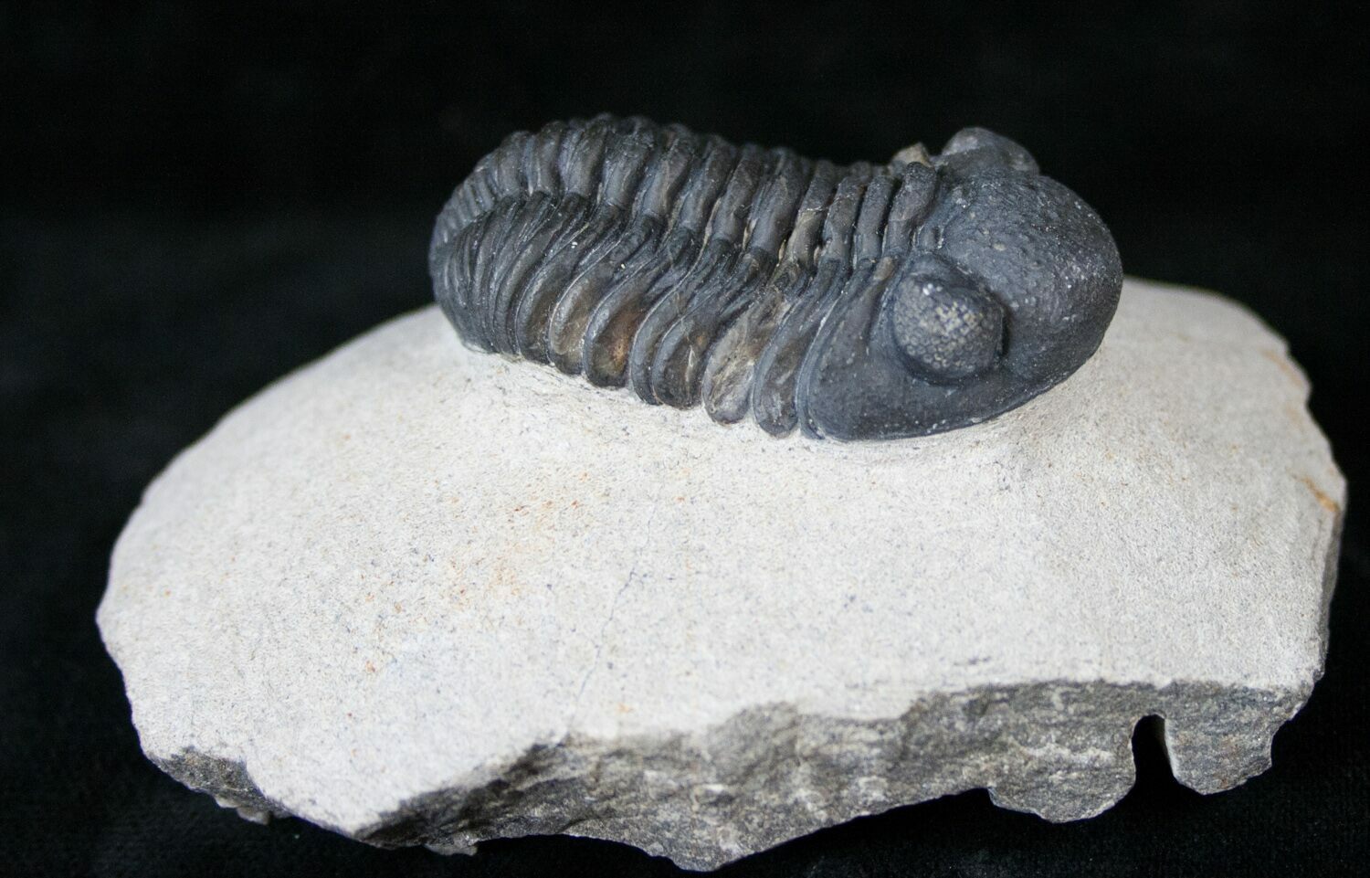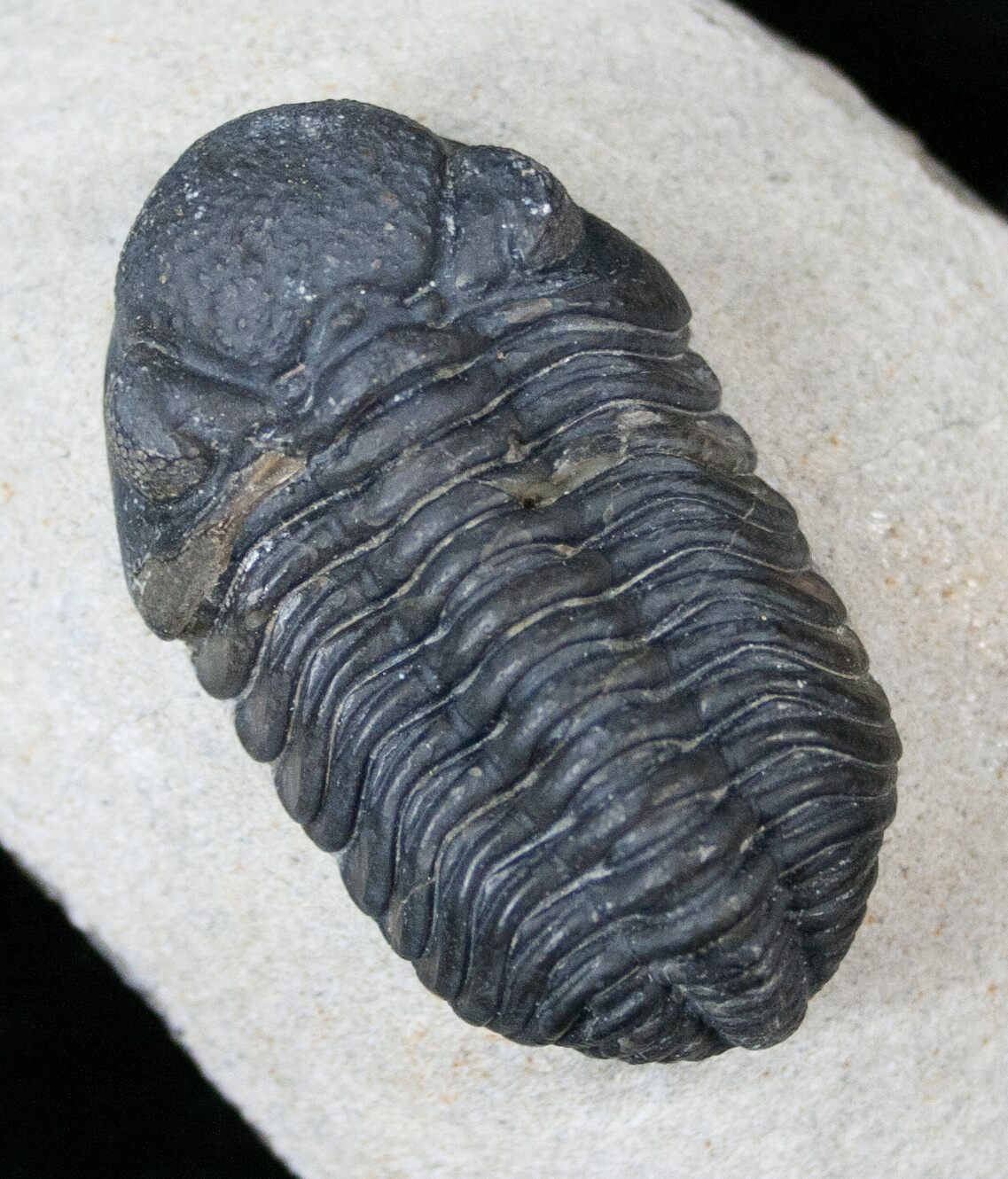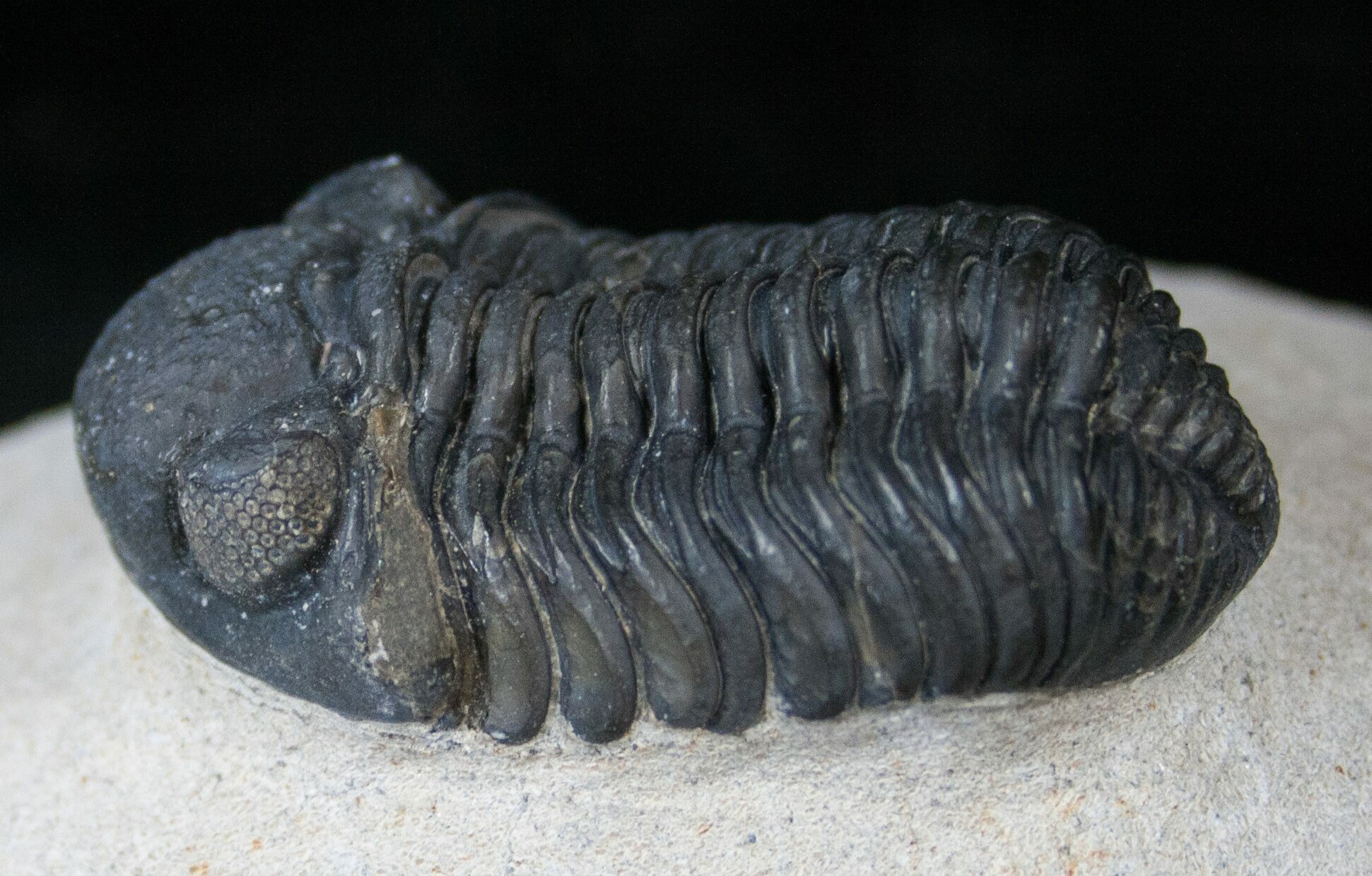 This is a 1.96" long Phacops trilobite from Jebel Mrakib, Morocco. It has been cleaned with air abrasives and the rock around it sculpted so that it displays nicely. Good shell detail including great eye facet preservation. A little bit of shell restoration on the edge of the right cheek following the repaired crack through the trilobite, about 2%