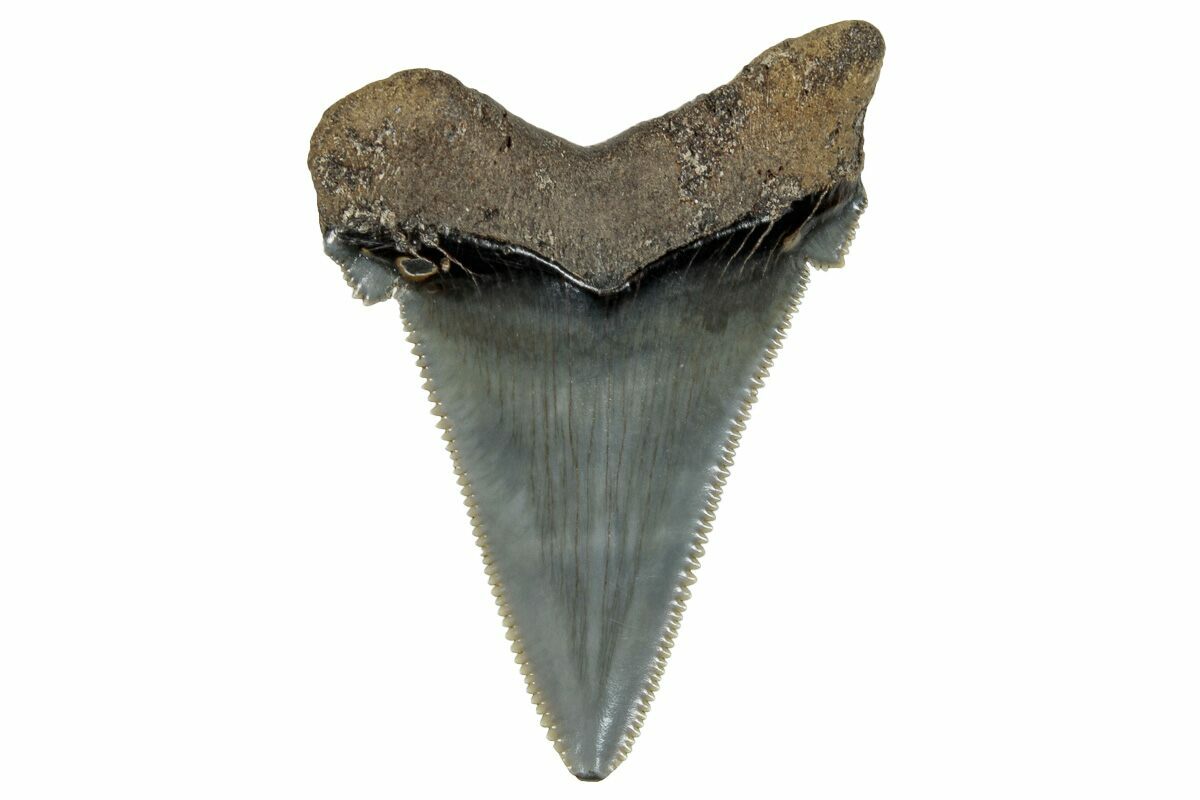 This is a beautiful, serrated, 1.96" long fossil Otodus angustidens shark tooth. Angustidens is believed to be an ancestor of the fearsome Megalodon shark, though it did not grow nearly as large.