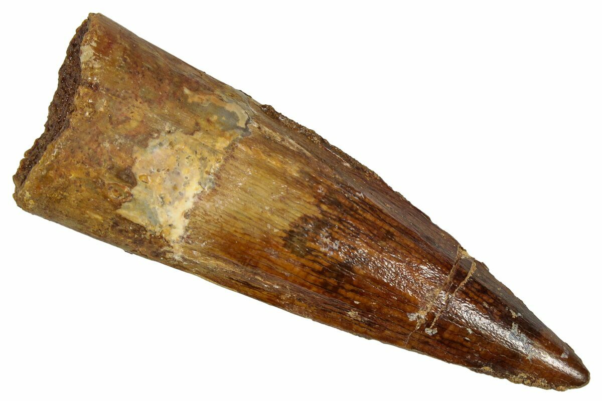 Spinosaurus teeth are relatively common fossils, but large (3+ inches), well-preserved examples are rare. These large Spinosaurus teeth will often be heavily doctored. We’ve seen many examples where multiple partial teeth can been glued to together to create a larger fake tooth, or where enamel has been painted on. One giveaway to look for is a ring of sand around the middle of the tooth, usually glued on to hide a break. Sometimes this is a sign that multiple partial teeth have been composited, but other times it is used to disguise a badly done repair job.