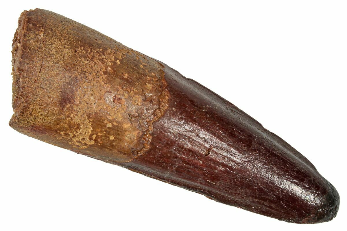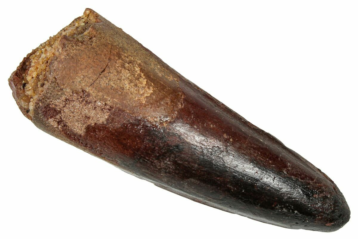 This is a 1.98" long Spinosaurus tooth from the Kem Kem Beds of Morocco. It is Late Cretaceous in age, approximately 95 million years old.