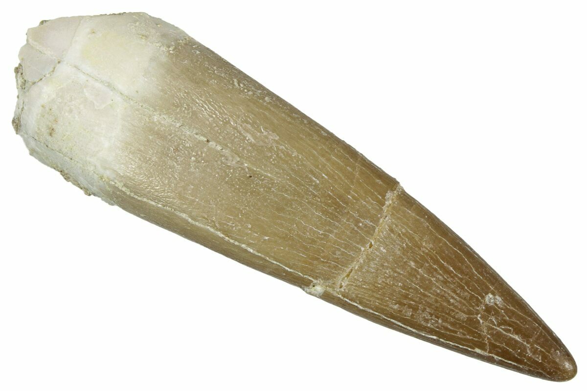 This is a 1.99" tooth from the Cretaceous marine reptile Zarafasaura oceanis, a long-necked plesiosaur known from the phosphate-rich Oulad Abdoun Basin of Morocco. The enamel displays nice preservation and natural coloration.