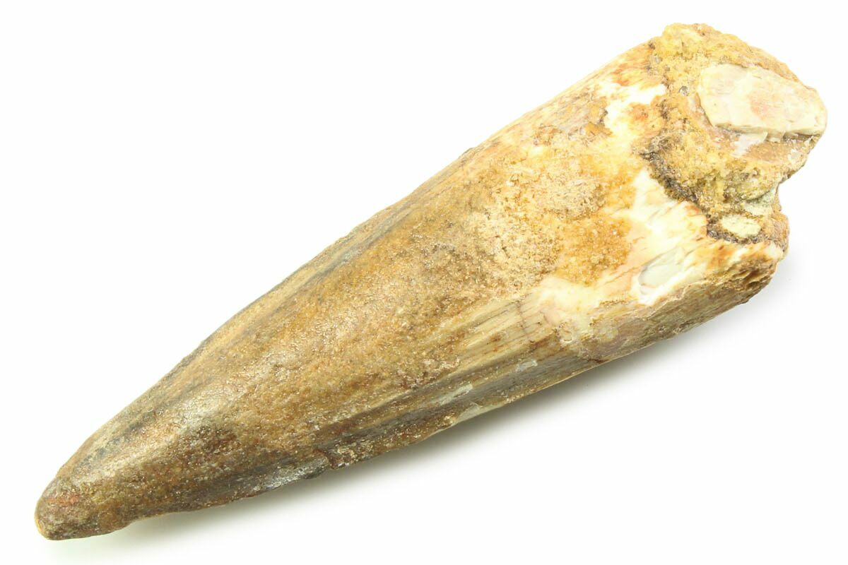 This is a 1.99" long Spinosaurus tooth from the Kem Kem Beds of Morocco. It is Late Cretaceous in age, approximately 95 million years old.