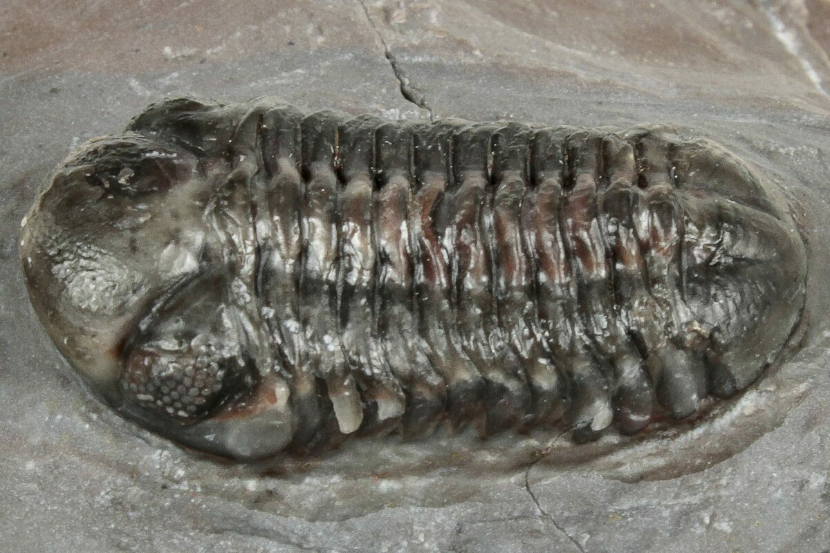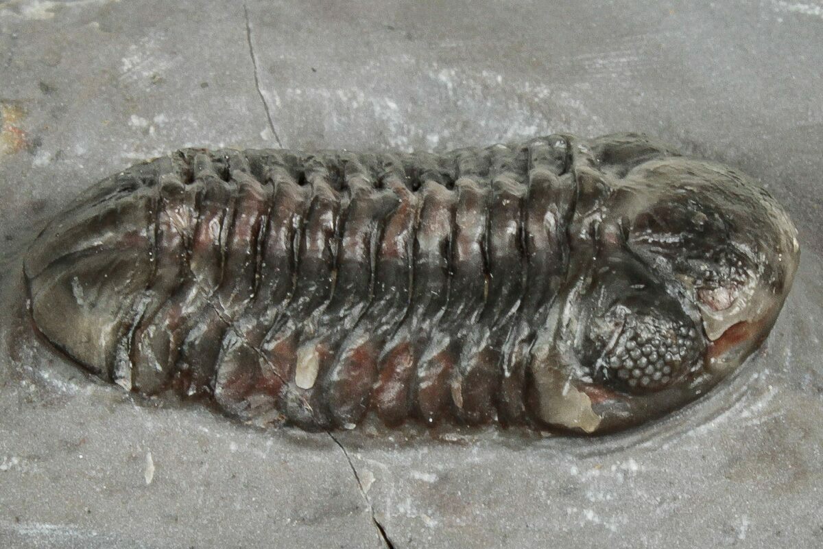 Trilobites are collected from a 15-meter-thick section about 6kilometers northwest of Jorf, Morocco. Unlike many other localities, these rocks do not have distinct deposition layers, but rather are massive. They likely represent a gigantic "mud mound" that formed at the base of a volcanic island due to mud slides. The rock is very silicified, almost like a chert, and can be quite colorful. The actual shells on the trilobites are translucent: the trilobite tends to be the color of the rock it sits on.