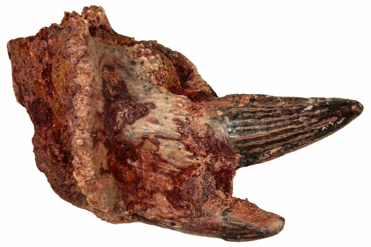 This is a crocodylomorph jaw section from the Kem Kem Beds of Morocco. The bone appears to be a section of the pre-maxilla and contains two beautifully preserved teeth. The Kem Kem Beds are home to several genera of crocodylomorphs and pinpointing an exact genus is rather difficult.