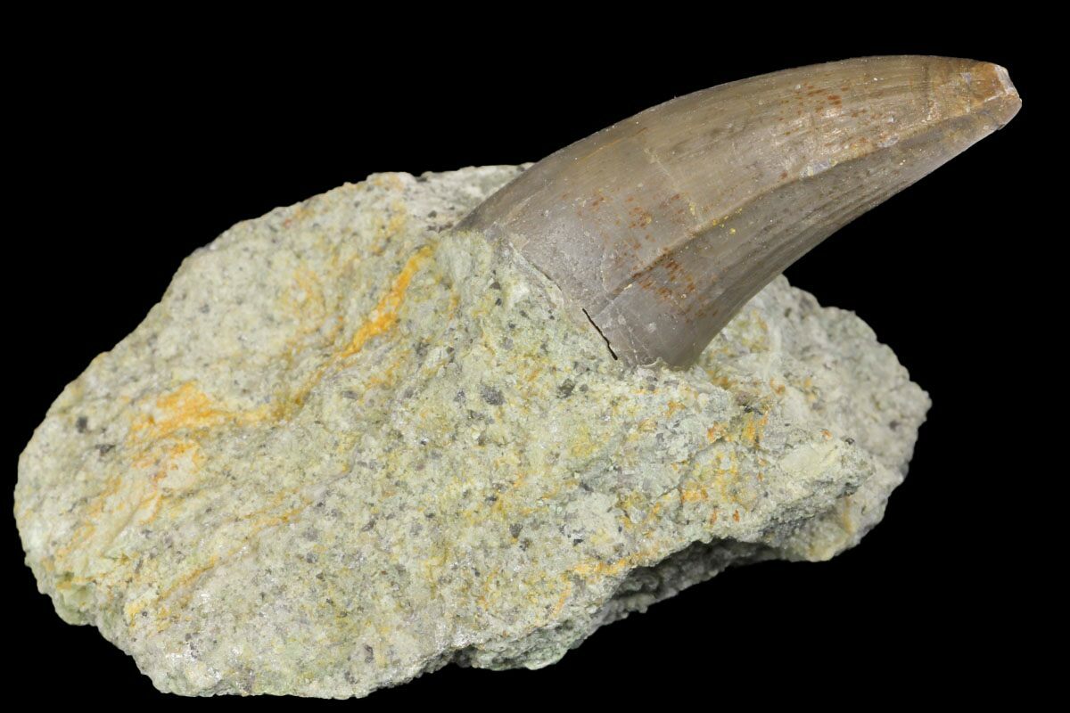 This is a 1" long crocodile tooth from the Morrison Formation of Colorado. It was collected this past summer from our partners private quarry East of Dinosaur, Colorado. It's a very large croc tooth from the formation and nicely preserved. It was left partially embedded in the sandstone that it was found in. It's likely of the genus Goniopholis.