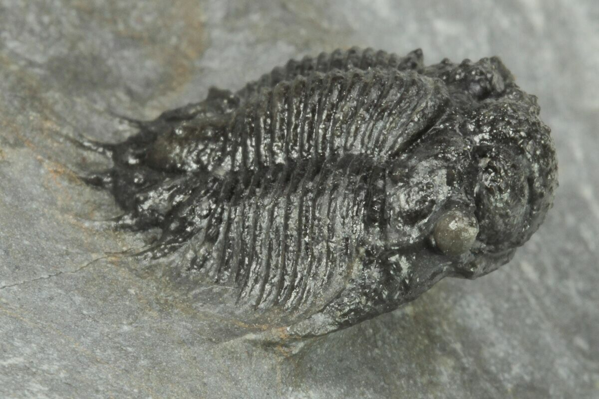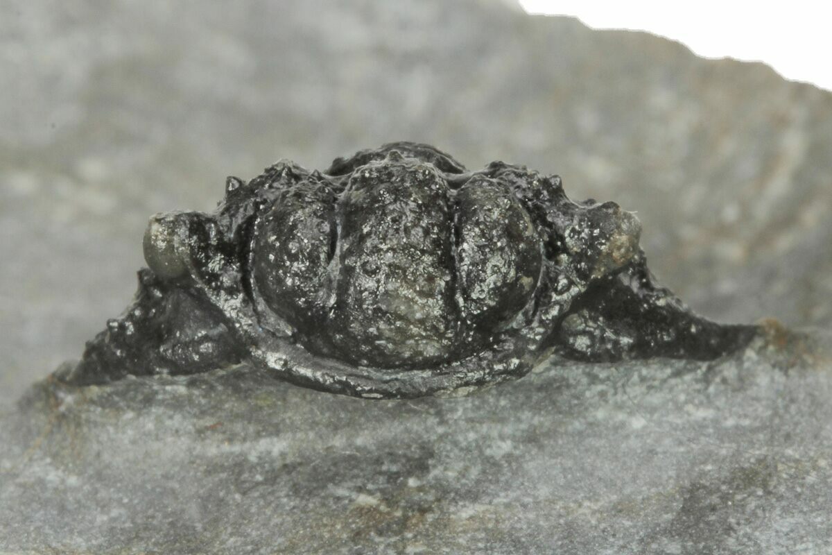 This is a very nicely prepared example of a small, lichid trilobite (Acanthopyge bassei) from the Middle Devonian of Morocco. Exceptional preparation on this very detailed trilobite. It's .8" long but would probably be about 1" if outstretched. Fine preparation with all of the tiny pustules and stalk eyes preserved.