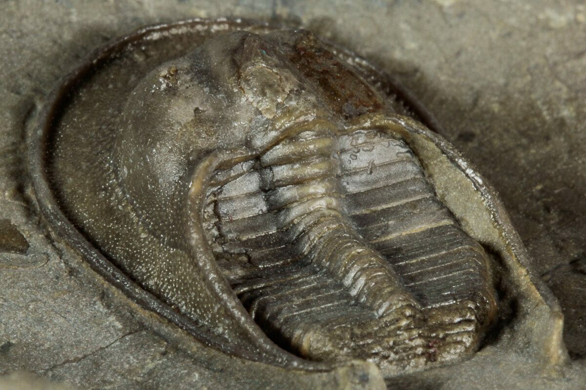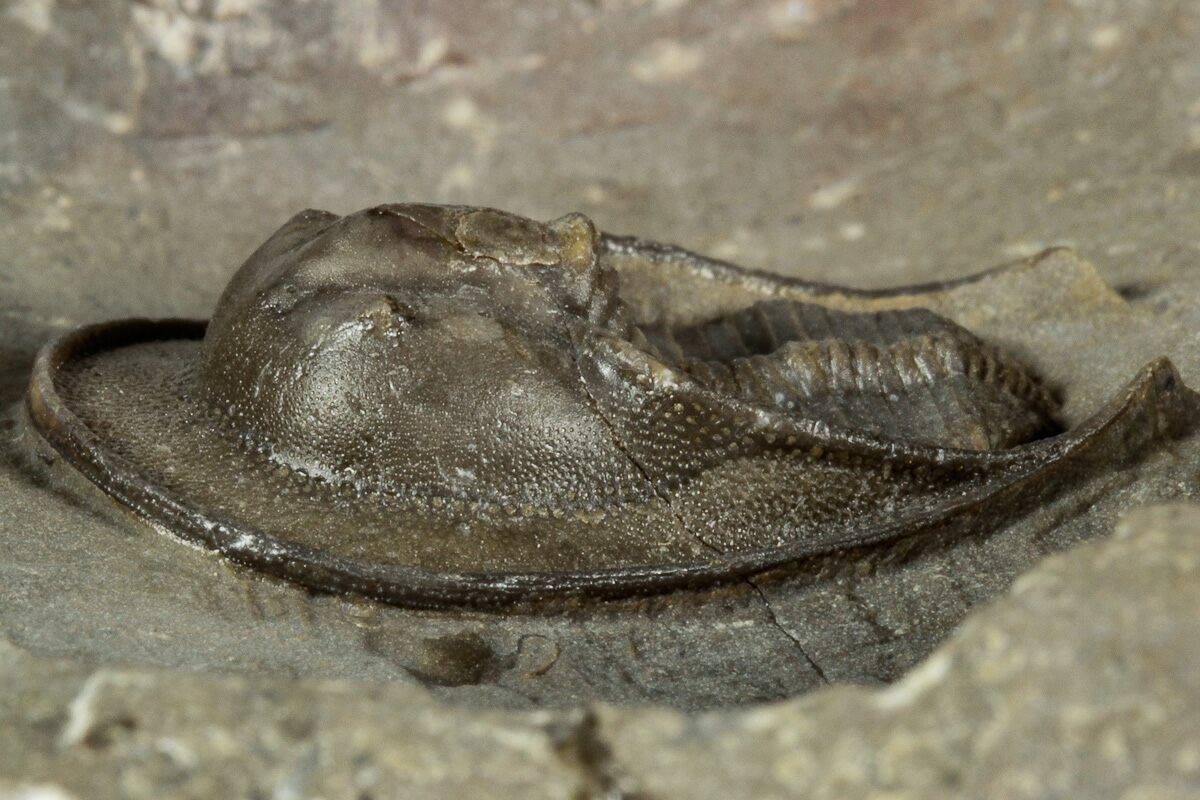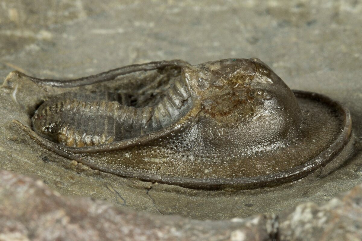 This is a gorgeous specimen of what may be a new species of Harpes trilobite from Ouzina, Morocco. It measures 1" long, has a very wide head-shield. It has a few small spots of restoration, maybe 1-2% in total.