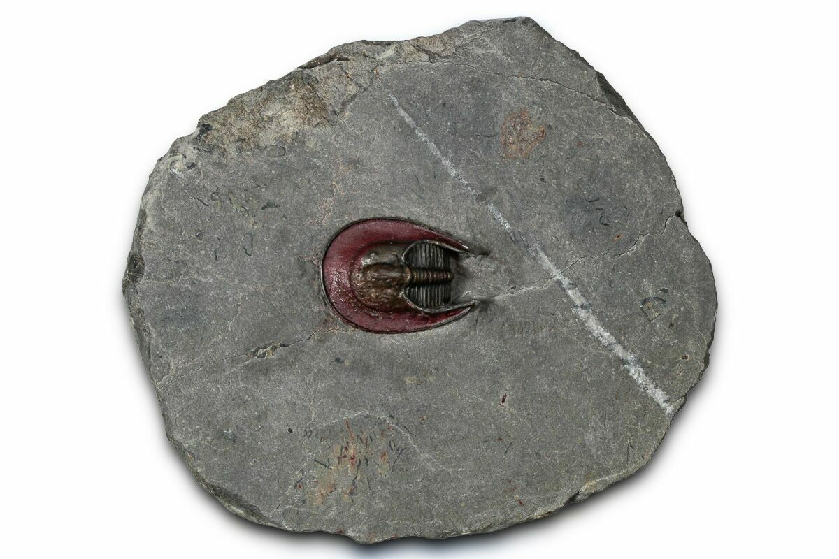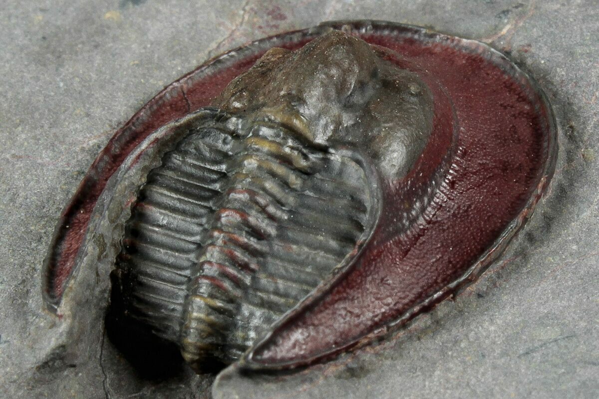 This is a gorgeous specimen of what may be a new species of Harpes trilobite from Ouzina, Morocco. It measures 1" long, has a very wide head-shield. It has about 3% shell restoration on the let side of its head.