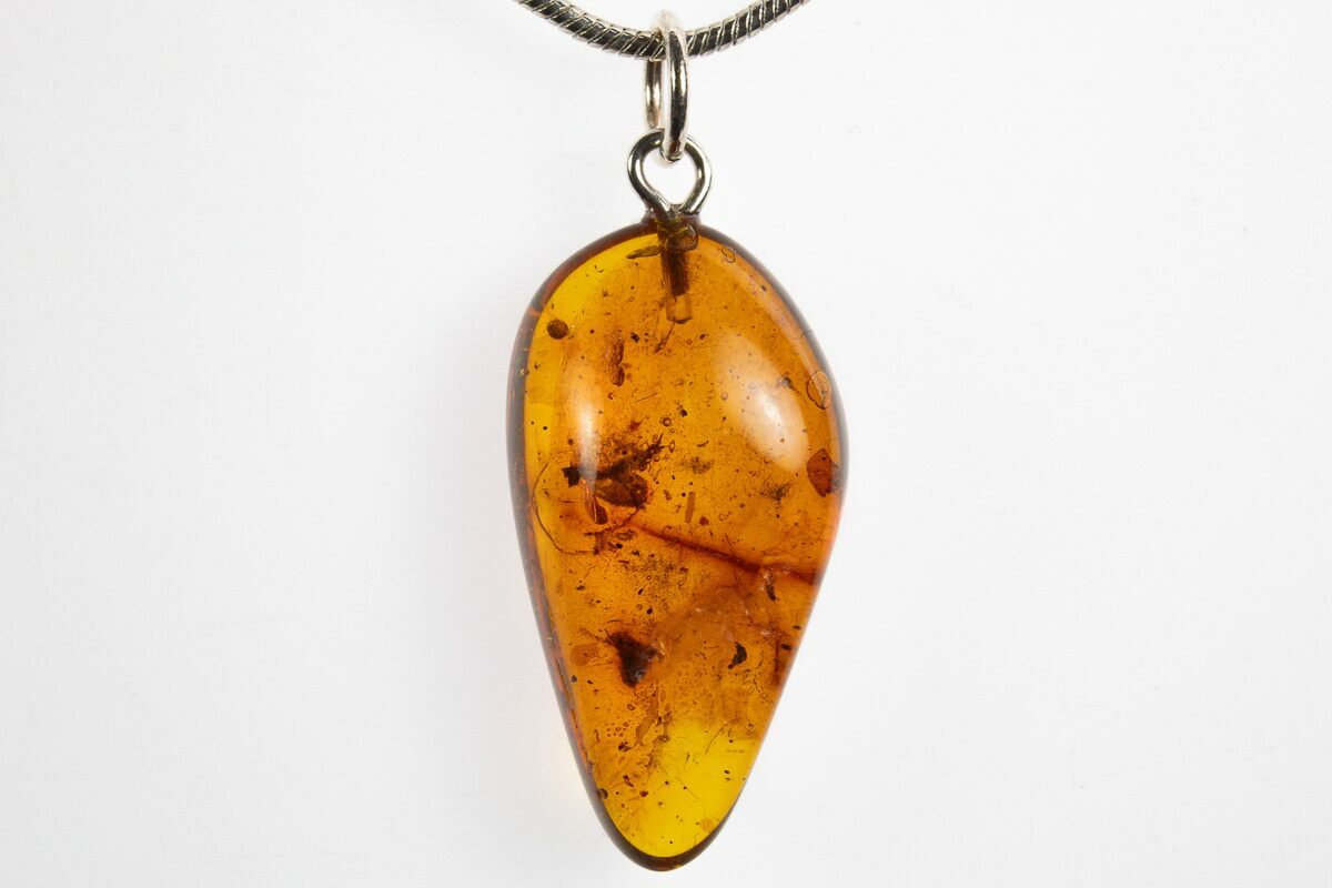 This is a 1" tall (including loop) pendant made from 44 million year old Baltic amber. Within the amber, an unidentified insect can be seen. A loop has been attached to the amber, along with a secondary ring for the included 24" silver plated snake chain to complete the necklace.