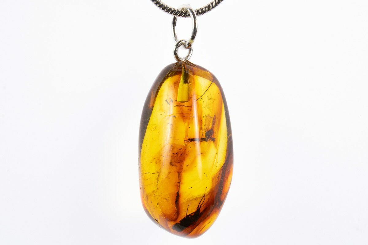 This is a 1" tall (including loop) pendant made from 44 million year old Baltic amber. Within the amber, two fossil flies (order Diptera) can be seen. A loop has been attached to the amber, along with a secondary ring for the included 24" silver plated snake chain to complete the necklace.