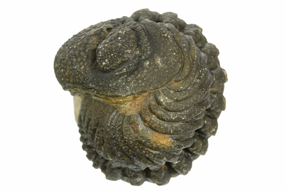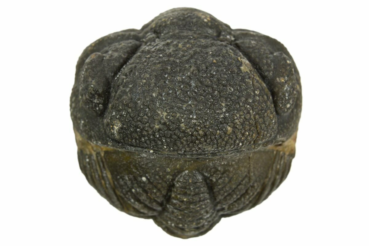 This is an enrolled, 1" wide Morocops trilobite from Morocco. It has a very bumpy shell and visible eye facet detail in both eyes.