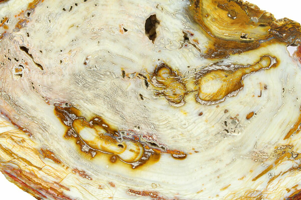 This is a 10.1" wide round of white pine petrified wood, collected from Park City, Utah. It has been cut into a slab and polished to a glossy finish on one side. The polish really brings out the beautiful colors and excellent grain preservation.
