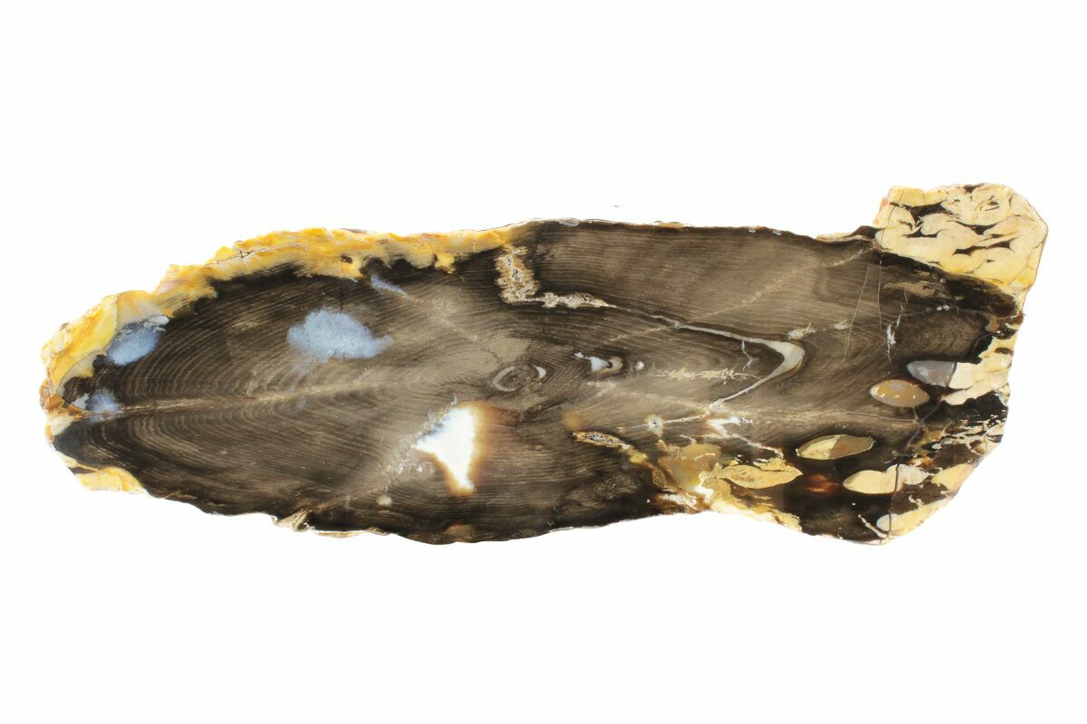 The host wood itself originated from ancient Araucaria trees, but it’s the activity of these shipworms that tells the real story. Their borings reveal that the wood spent time afloat in prehistoric oceans before fossilization, capturing a rare moment where marine and terrestrial environments intersected. As mineral-rich groundwater permeated the buried driftwood, the organic tissue was gradually replaced by silica, preserving both the wood structure and the shipworm tunnels in remarkable detail. The result is a visually stunning fossil that showcases not only the anatomy of an ancient conifer, but also the imprint of the tiny organisms that once lived inside it—making Australian peanut wood a beautiful intersection of biology, geology, and deep-time storytelling.