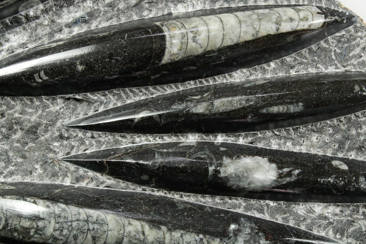 The fossils commonly known as Orthoceras are extinct "straight" cephalopods that lived during the Upper Devonian period around 370 million years ago. Like other cephalopods, they lived inside of their shells, had tentacles they could use to grab food, and used jet propulsion, squirting water to move. The rock containing them is quarried from the Atlas Mountains of Morocco and frequently polished to reveal the fossils and make decorative items with them.