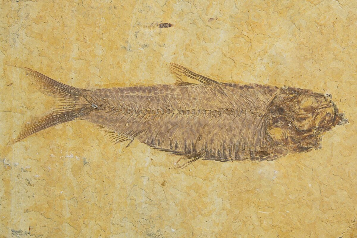 This is an association of two fossil fish, Diplomystus dentatus and Knightia eocaena. The larger of the two (Diplomystus) is 5.45" long and pretty poorly preserved. This specimen comes from a specific bedding plane in our own Fossil Lake Safari quarry that we refer to as the mud layer. It's a volcanic ash layer which contains a mass mortality of different fish.