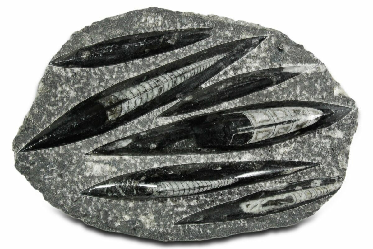 The fossils commonly known as Orthoceras are extinct "straight" cephalopods that lived during the Upper Devonian period around 370 million years ago. Like other cephalopods, they lived inside of their shells, had tentacles they could use to grab food, and used jet propulsion, squirting water to move. The rock containing them is quarried from the Atlas Mountains of Morocco and frequently polished to reveal the fossils and make decorative items with them.
