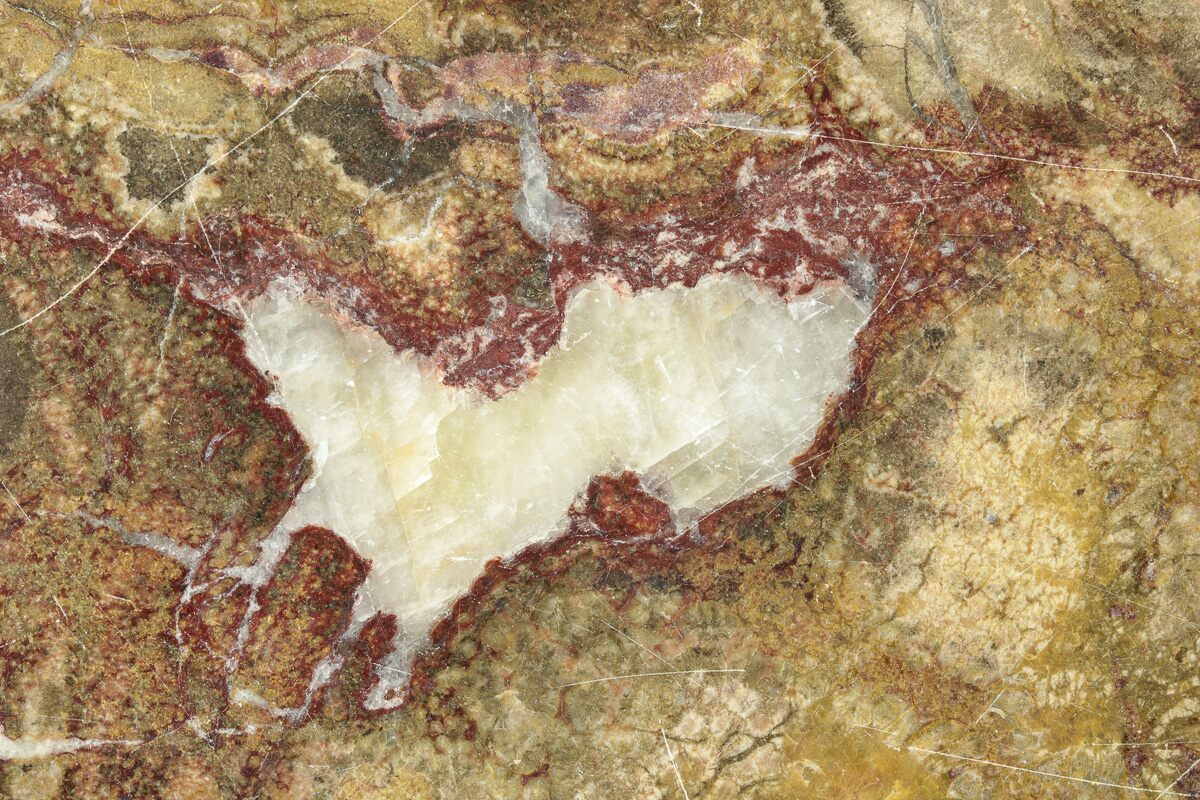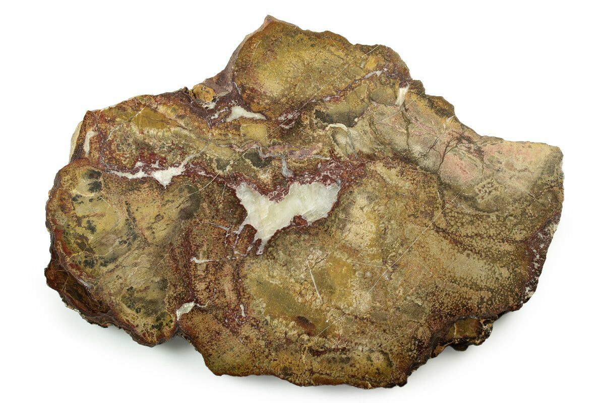 This is a 10.2" wide slab of petrified wood from Holbrook, Arizona. It bears a beautiful mixture of red and yellow coloration, with a pocket of calcite at its center. One side has been highly polished to a mirror-like finish and the opposite side has been backed with epoxy and fiberglass.