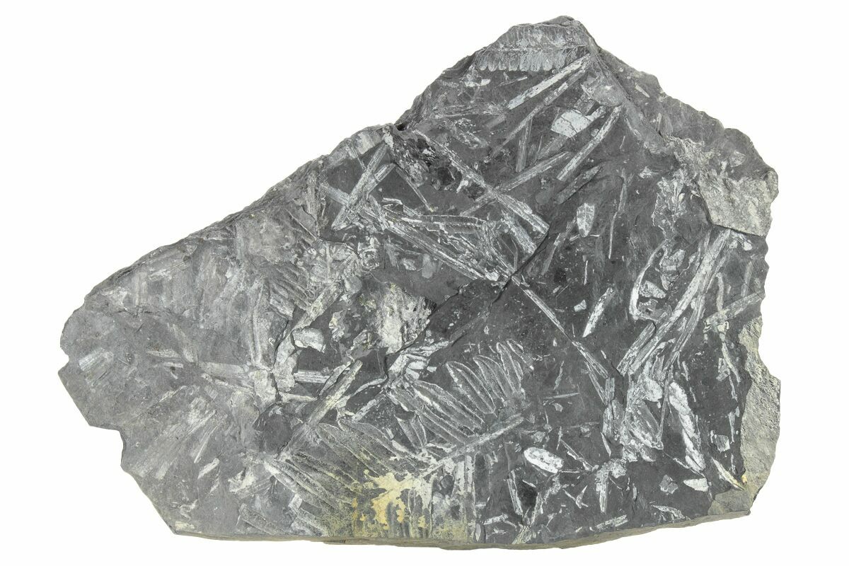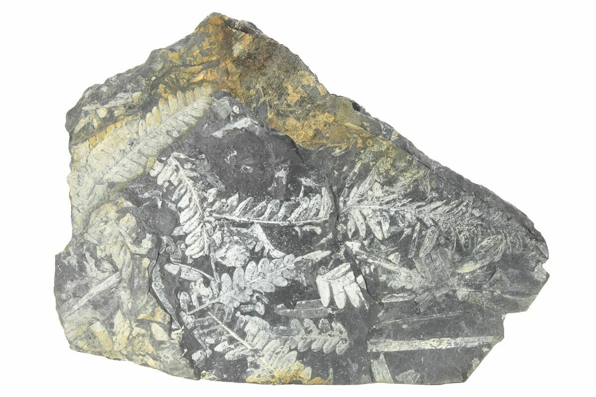 This is a plate of seed fern fossils from the Pennsylvanian aged (3010.3 million year) Llewellyn formation of Pennsylvania. The white color of these detailed fern fossils contrasts well against the black shale they are preserved in. These plants were buried in a swamp where a low temperature, pressure, and oxygen environment the plant tissue was slowly replaced by pyrite. This pyrite was later replaced by a whitish mineral (aluminum silicate) as the fossils were buried and exposed to the heat and pressure inside of the earth. There are multiple types of seed ferns (which look very similar) on these plates including Alethopteris and Pecopteris.