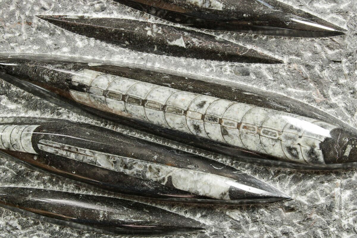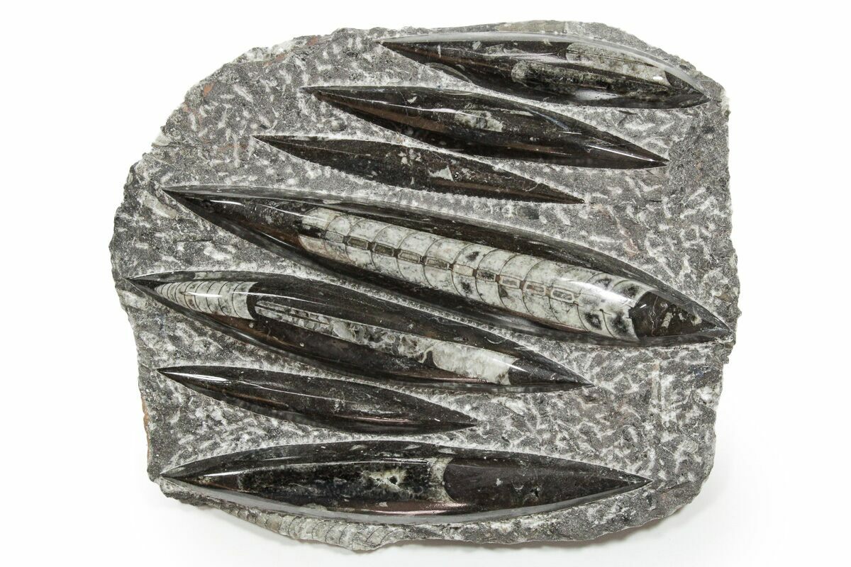 The fossils commonly known as Orthoceras are extinct "straight" cephalopods that lived during the Upper Devonian period around 370 million years ago. Like other cephalopods, they lived inside of their shells, had tentacles they could use to grab food, and used jet propulsion, squirting water to move. The rock containing them is quarried from the Atlas Mountains of Morocco and frequently polished to reveal the fossils and make decorative items with them.