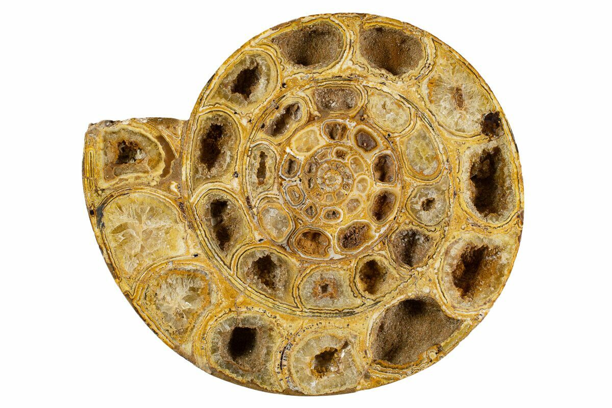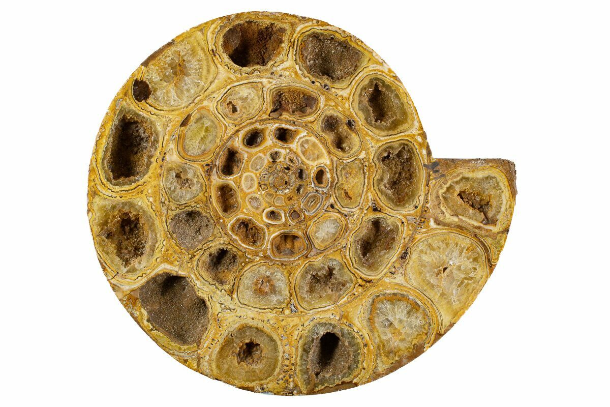 Some of these chambers are still partially hollow and lined with calcite crystals. The ammonite was cut in half and polished revealing the inner chamber structure of this ancient marine animal. There has been some repair work as these larger ammonites are almost always fractured while in the ground.