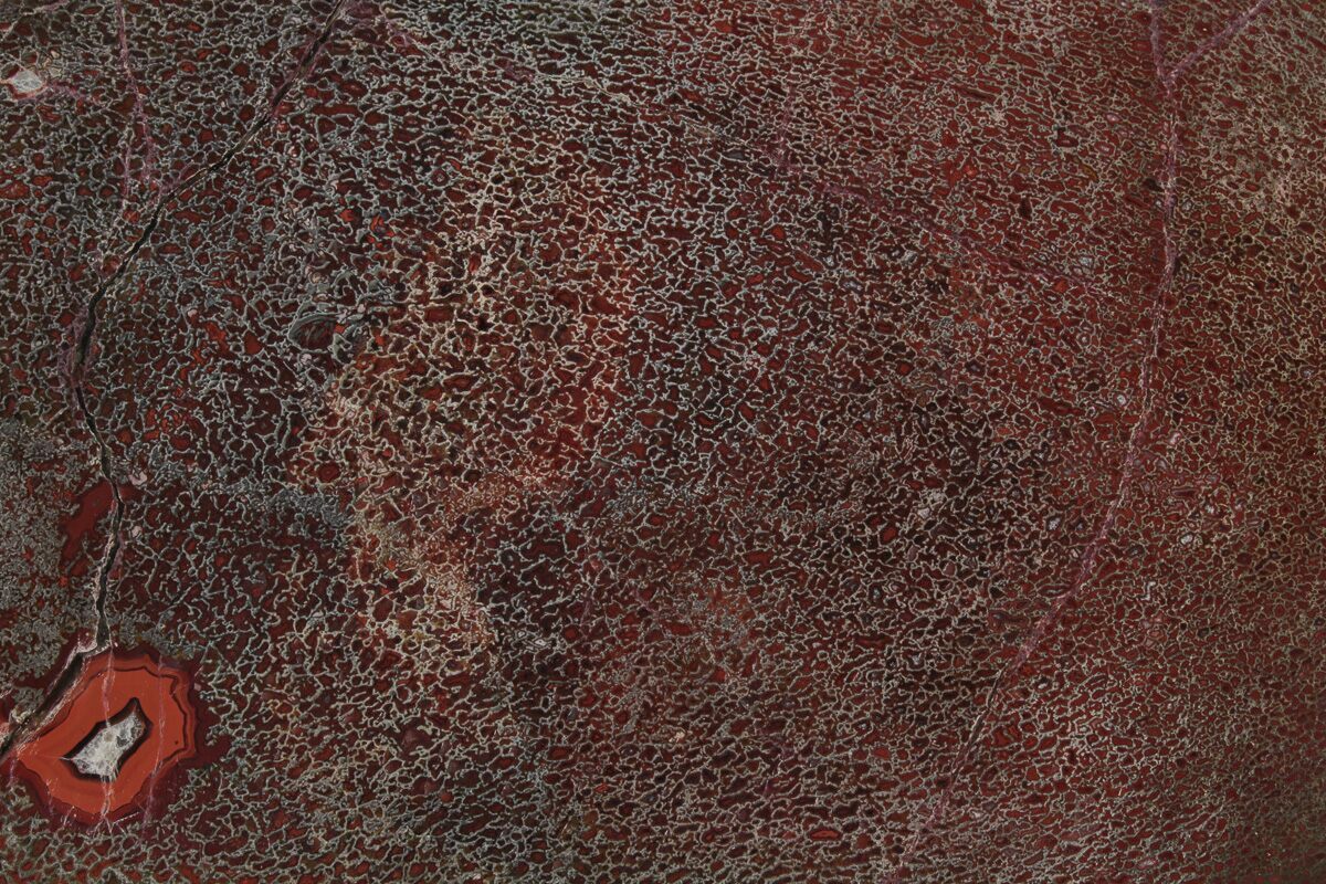 This is a brilliant red, 10.6" wide slab of agatized dinosaur bone from the Morrison Formation of Utah. One side has been polished to a glossy finish which allows for the beautiful internal cell structure to be seen. The slab has a couple of stabilized cracks near it's edges.