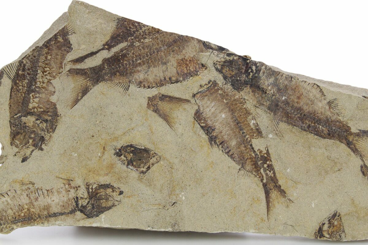 This is a 10.6 x 4" mortality plate of detailed fossil herring (Gosiutichthys parvus) from the Green River Formation of Wyoming. It comes from a different location than most of the Green River fish fossils, representing the ancient Lake Gosiute, not Fossil Lake. The preservation is also quite different compared to the fossil fish found in the Fossil Lake deposits, being a course grained mudstone. They are very detailed, with the bony structures, fins, and scales easily seen.