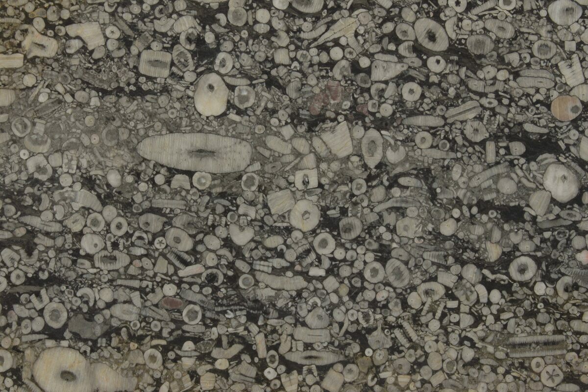 This is a large slab containing crinoid stems and various other crinoid segments, in marble. It has been cut flat on both sides and later covered with a clear epoxy giving it a glossy, polished appearance.