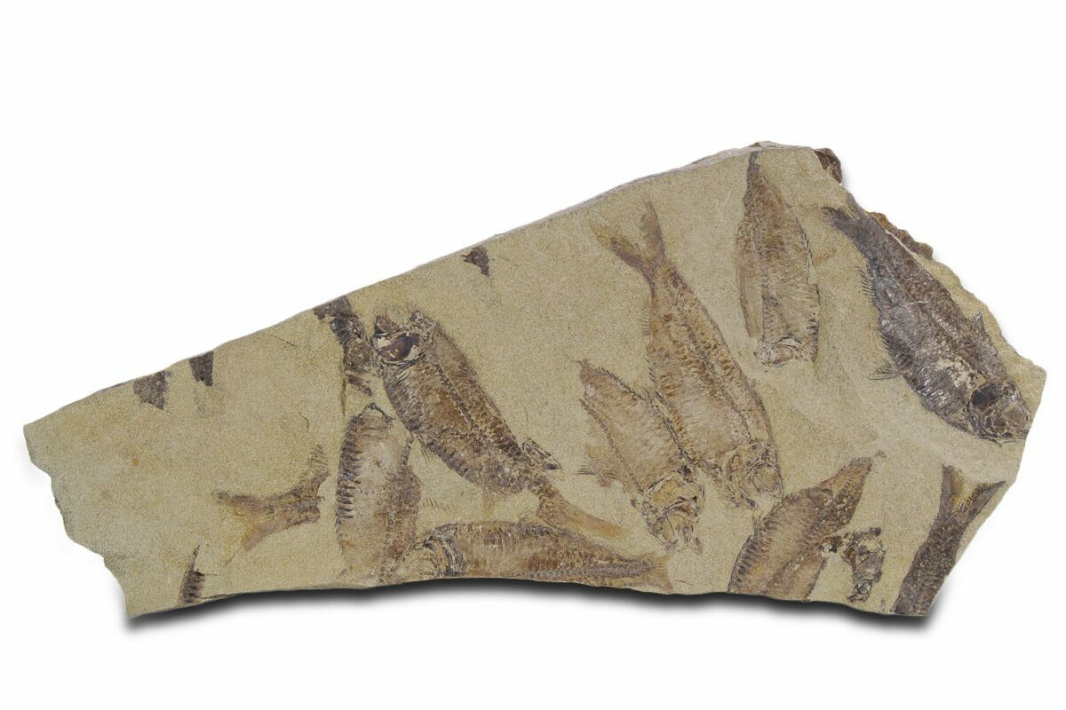 This is a 10.7 x 4.8" mortality plate of detailed fossil herring (Gosiutichthys parvus) from the Green River Formation of Wyoming. It comes from a different location than most of the Green River fish fossils, representing the ancient Lake Gosiute, not Fossil Lake. The preservation is also quite different compared to the fossil fish found in the Fossil Lake deposits, being a course grained mudstone. They are very detailed, with the bony structures, fins, and scales easily seen.