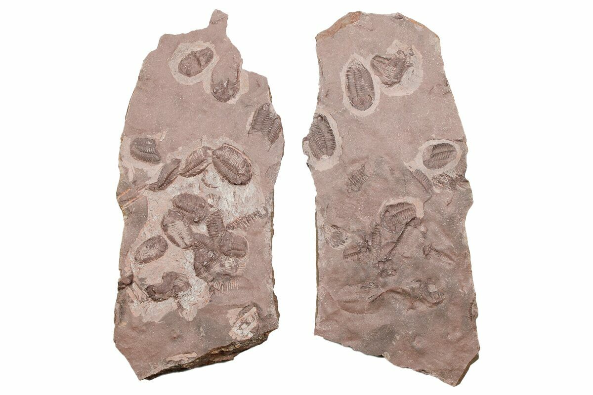 This is a 10.7 x 4.6" mortality plate of Ordovician trilobites from Tafraoute, Morocco. Both the positive and negative splits are included along with a pair of display stands.