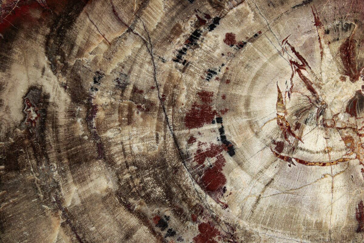 Petrified wood is the name given to wood that has been turned into stone (fossilized) through the process of permineralization. In this process, all of the organic matter becomes replaced by minerals, while much of the original structure, such as tree rings, is retained. For this to happen, the wood needs to be buried in an environment low in oxygen to prevent decomposition and with flowing, mineral-laden water, so minerals may replace structures. The coloration is caused by various minerals/impurities present in the water during fossilization. For example, red colors in many cases can be attributed to iron compounds, greens due to copper, and so on.