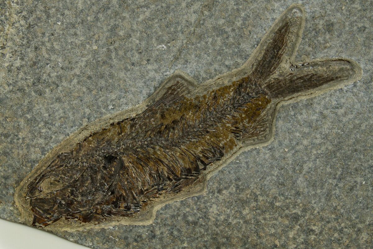 Specimens like this come from the coveted 18 inch layer of the Green River Formation, which produces darker and more detailed fish than the majority on the market. The rock from this layer is much harder and more durable than other layers in the formation, likely due to its initial deposition conditions in deep water. Because of these conditions, fish found in the 18-inch layer can be extracted whole and in excellent condition. This layer is typically collected at night using low-angle light to see the bump in the rock that the fish's backbone creates. They then cut these fish out and take them to a lab where the fish, which may be up to an inch under the surface of the rock, are meticulously extracted under microscope with hand tools.