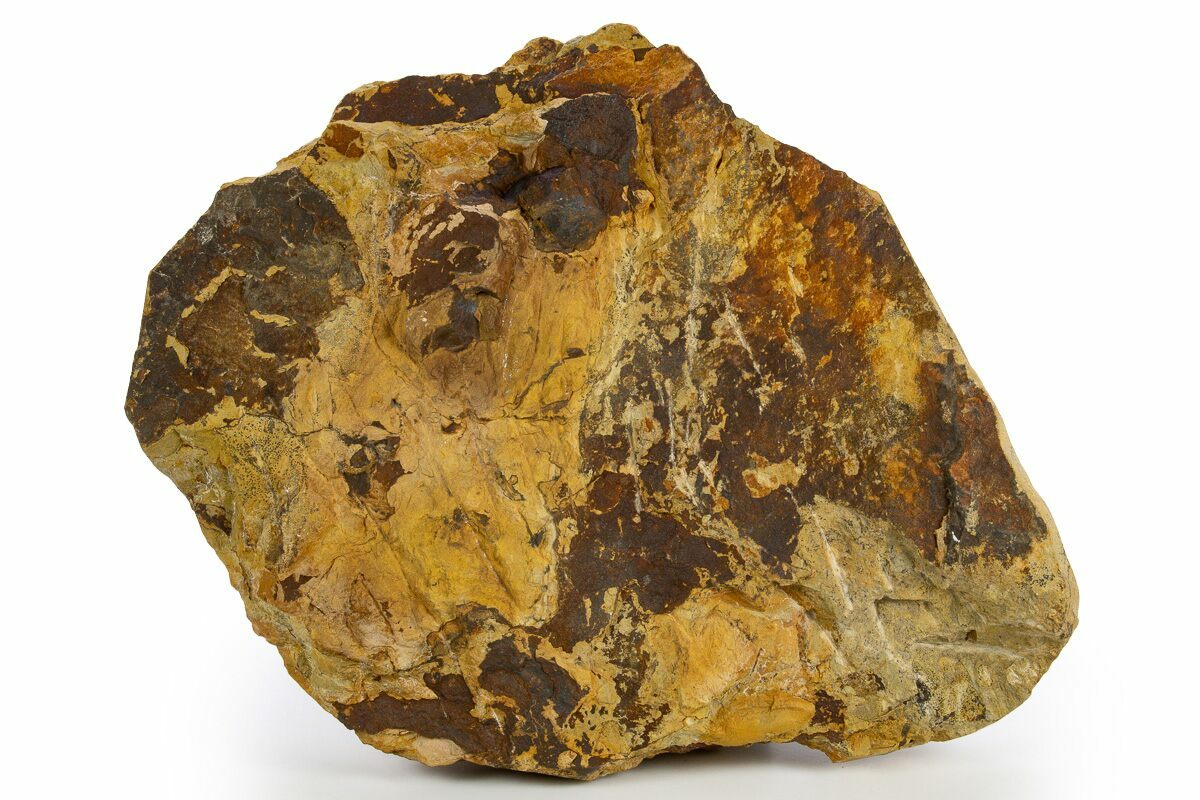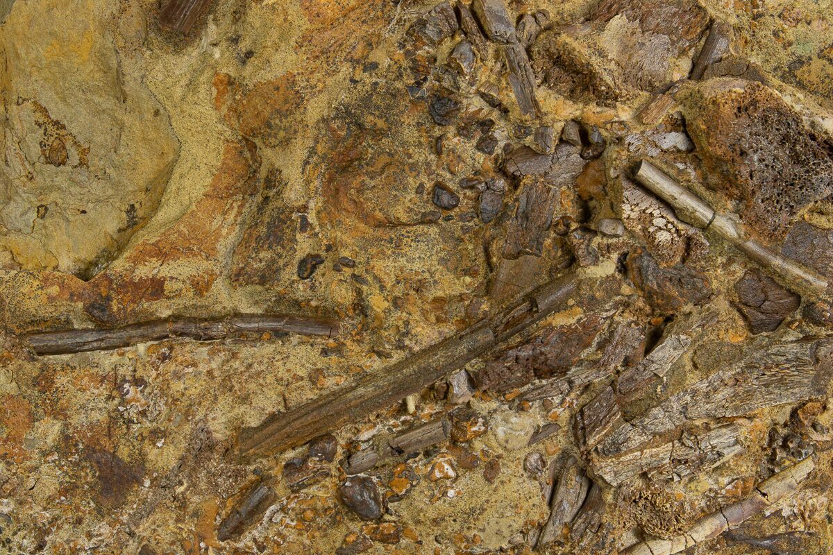 This 11.15" wide piece of sandstone contains a partial Triceratops tooth, a hadrosaur (Edmontosaurus annectens) tooth, bone fragments, and ossified tendons that have all been left in their natural positions within the rock. It was collected from the Lance (Creek) Formation of Wyoming. Based on abundance at this site, the bones and tendons are also likely from Edmontosaurus annectens.